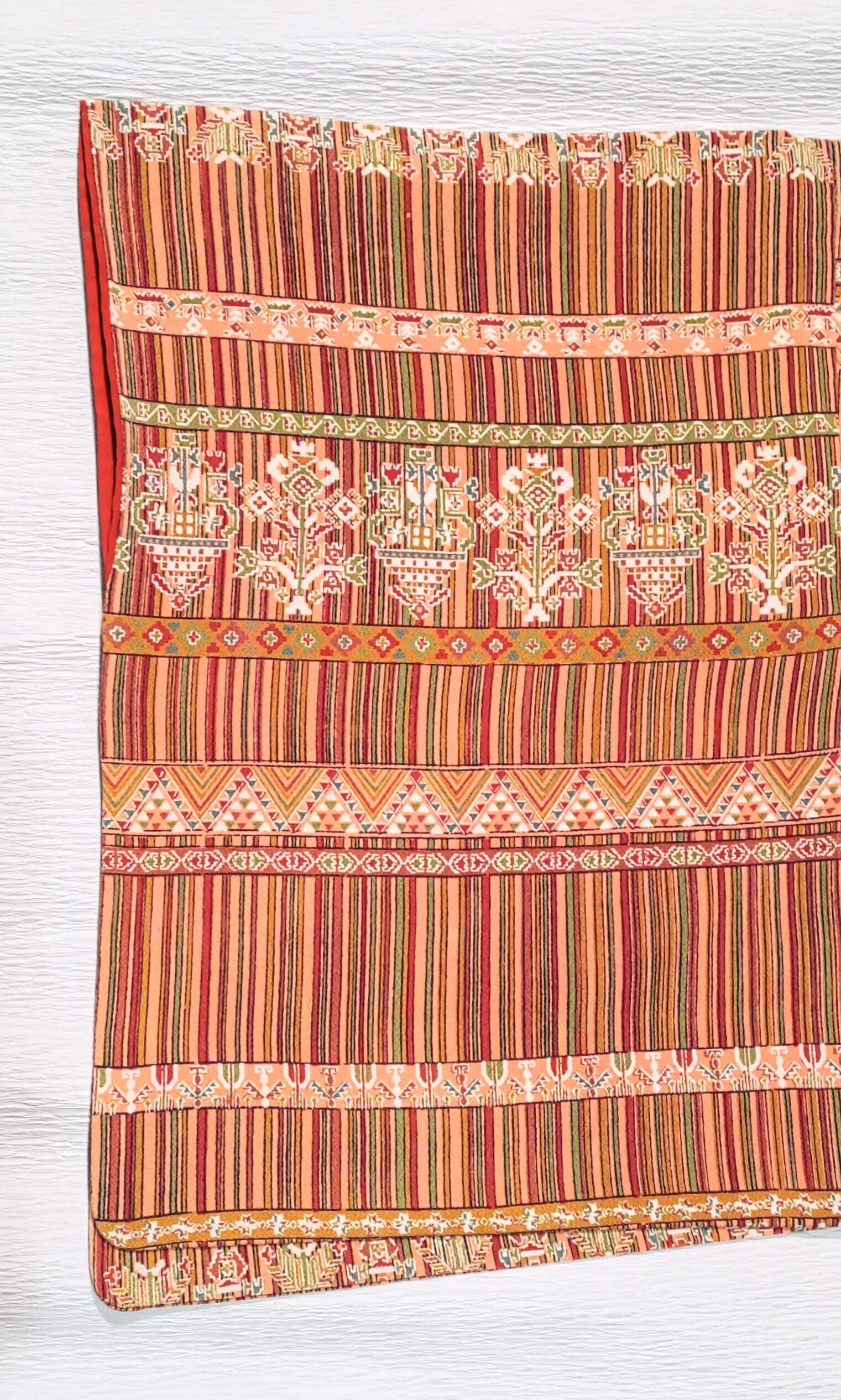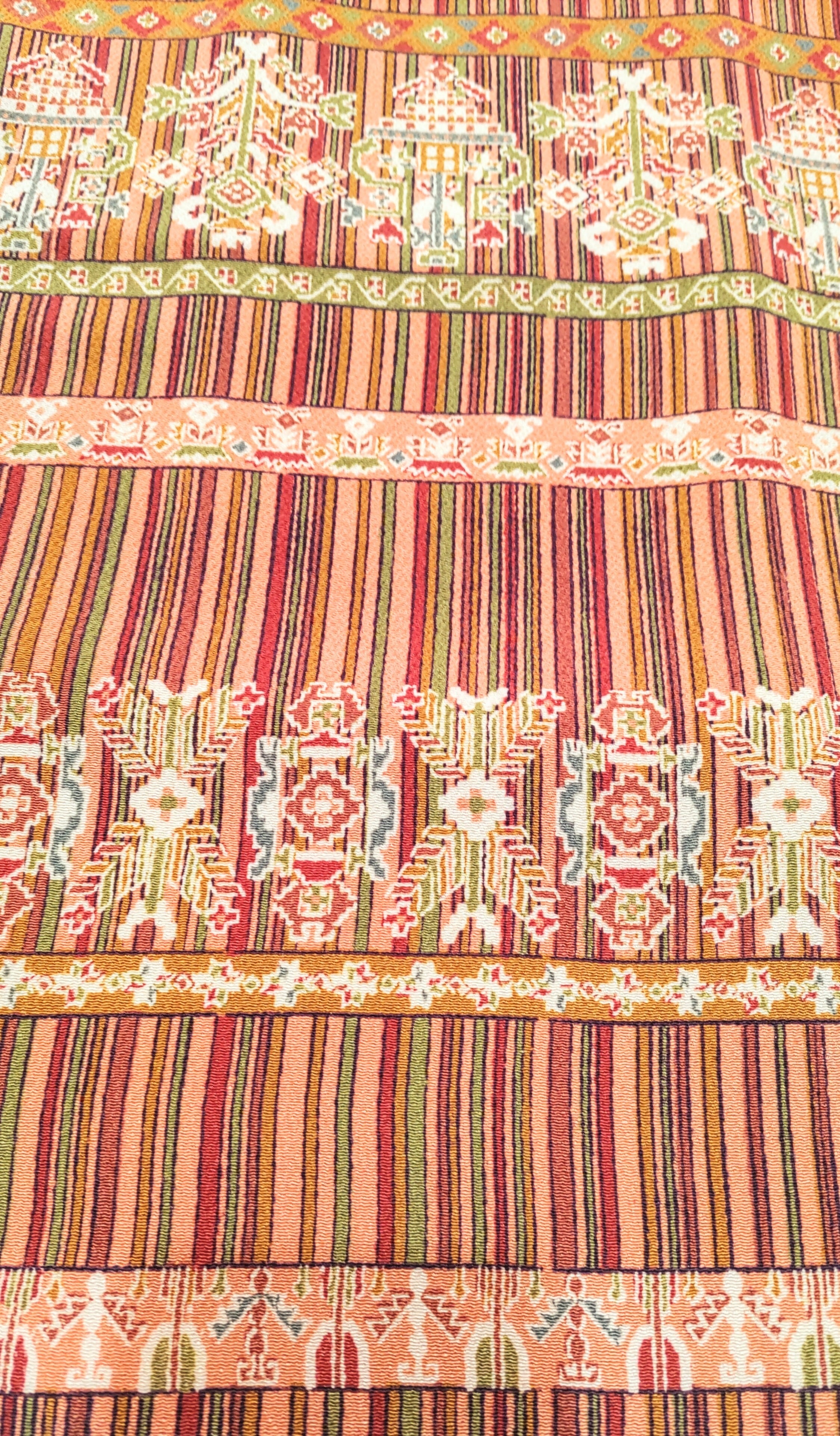 ストライプ(縞柄)にチロリアンテープのような、遺跡の壁画のような柄。