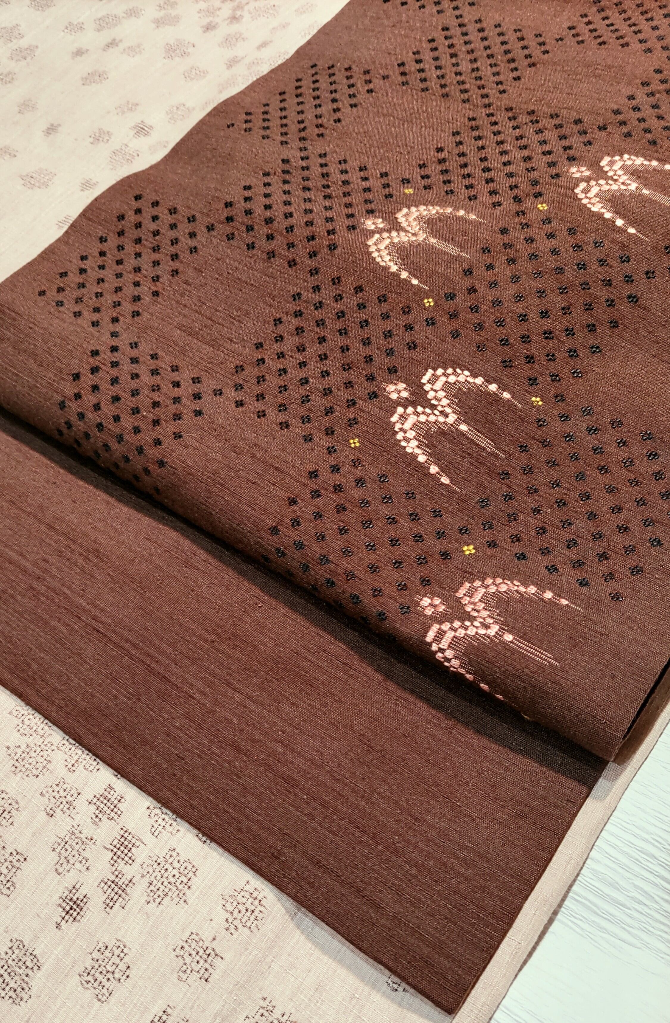 手織草木染で、ミルクチョコのような明るい焦げ茶色に、黒色と淡いベージュ色と淡いピンクベージュ色で琉球の古典柄が織りだされています。