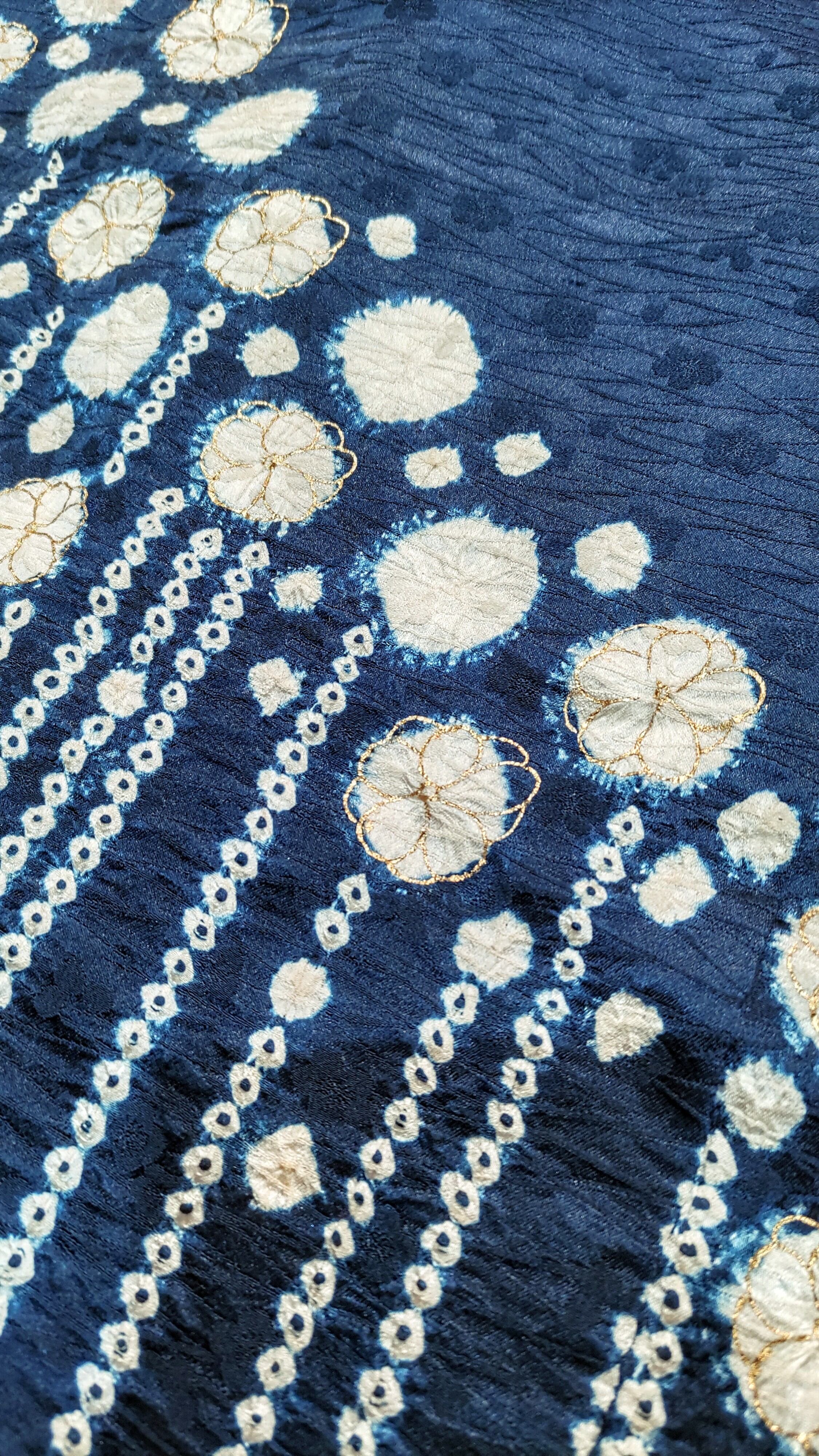 綺麗な紺地に浮かぶような白色の絞りは、垂れ下がる美しい枝垂れ梅や桜のよう。