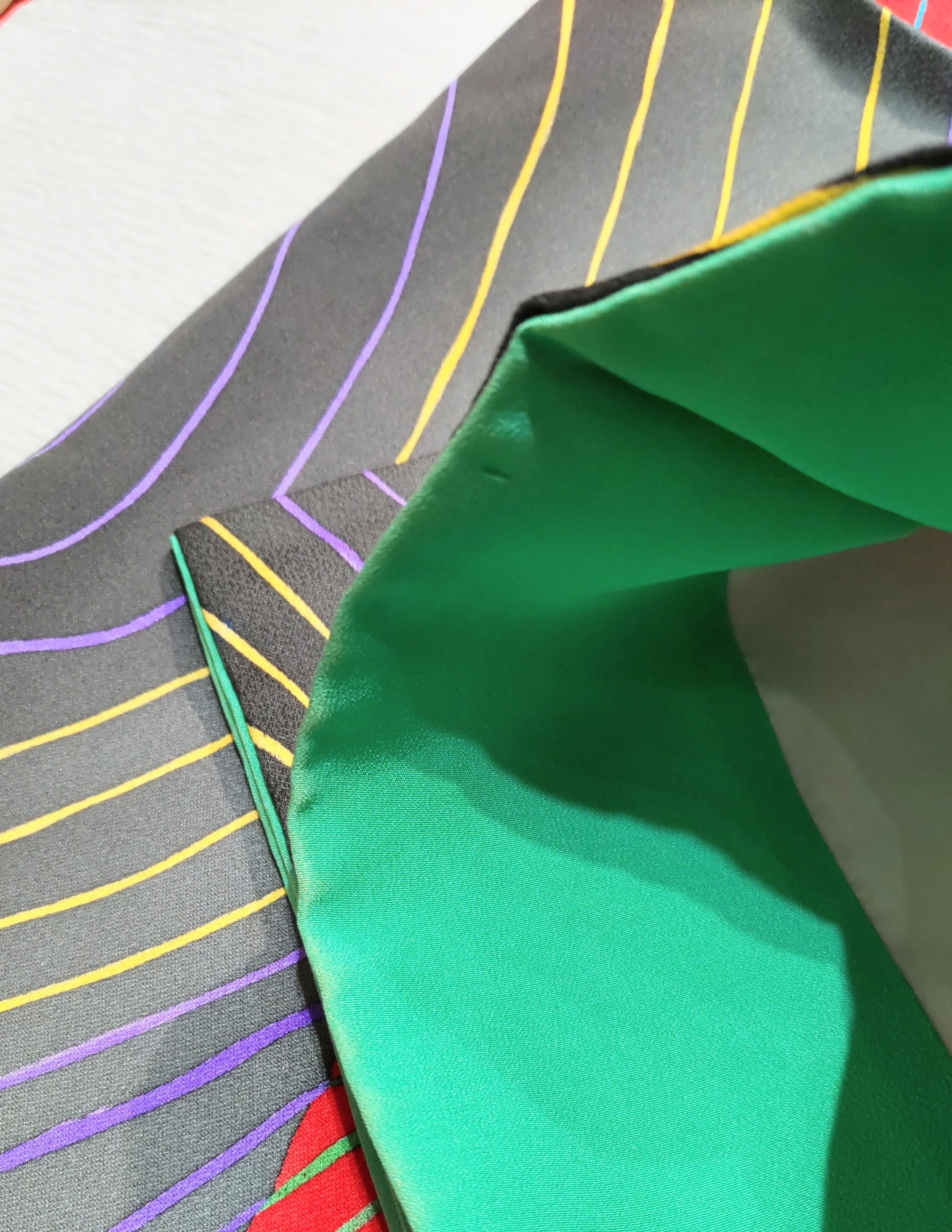 黒色から薄い墨色へのグラデーション、そこに黄色、紫色、赤色の曲線と不思議な赤色の模様、緑色の差し色が、まるで前衛的芸術作品のような魅力。