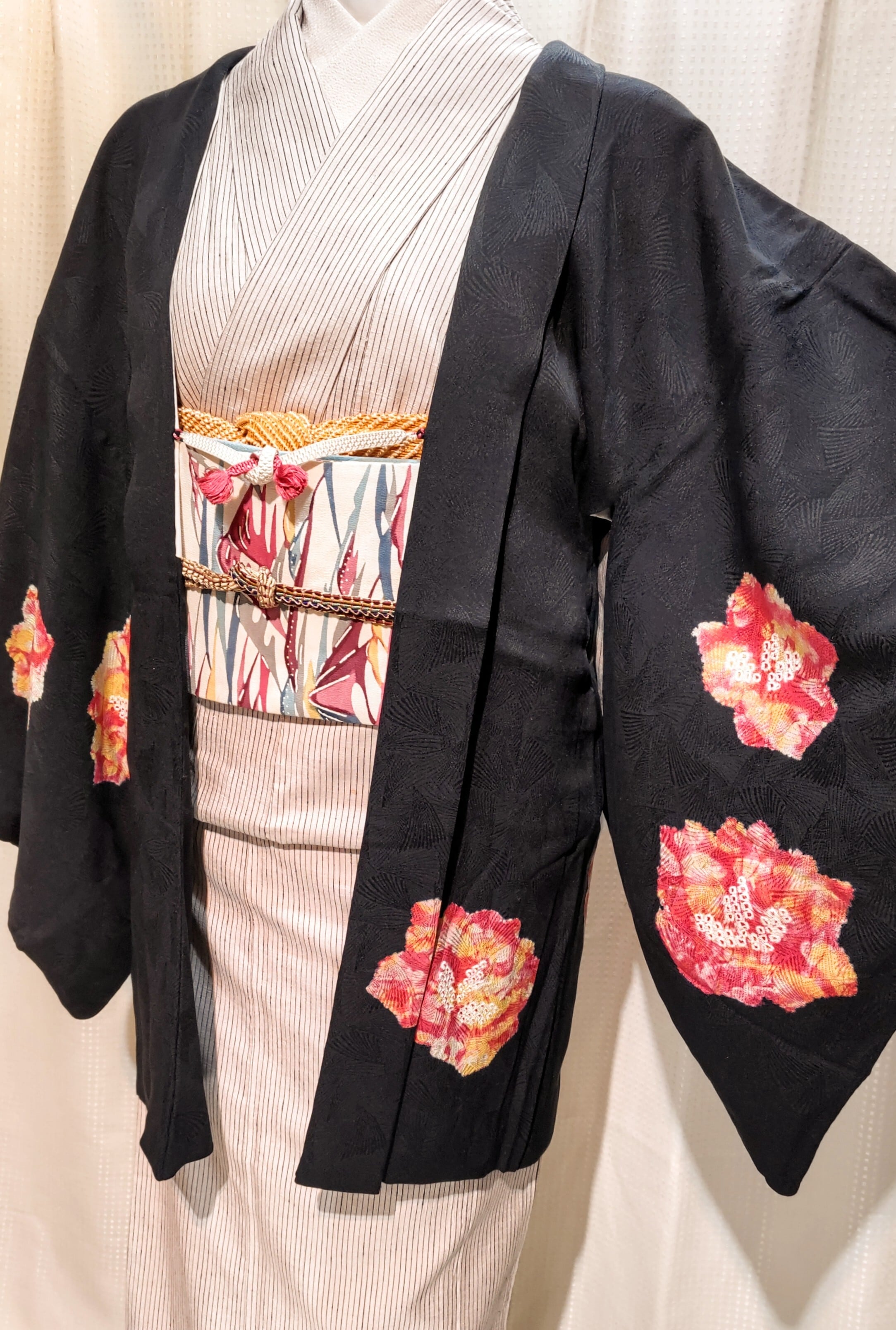 また美しい黒地がアンティークの繻子のようで、現代物だけでなくアンティークのお着物と合わせて頂くのもおすすめです。