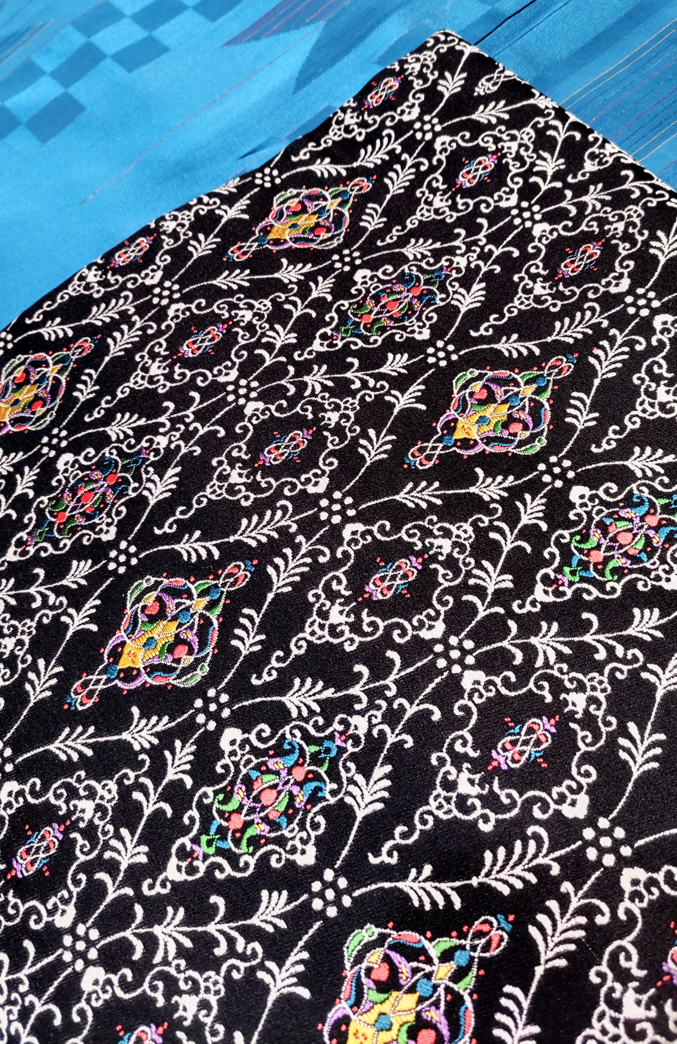 黒地に白色で蔦の絡まる立涌とレースモチーフのような柄、そこに紫色、黄色、緑色、コーラルピンク色、青色の差し色がとてもお洒落です。