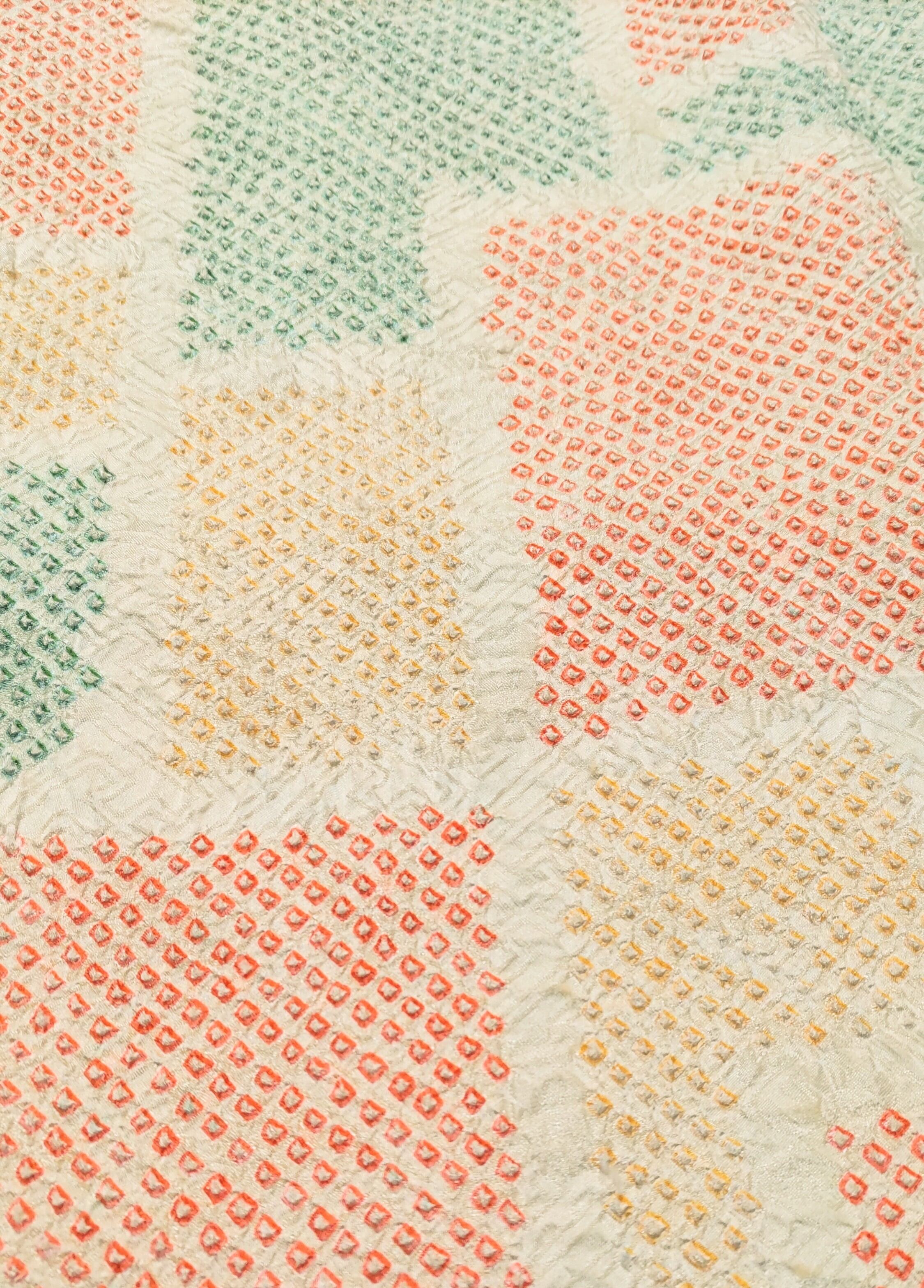 クリーム色(白色に近い淡く薄い黄色)に、黄色、緑色、オレンジ色の幾何学模様が遊び心溢れる、素敵な絞りの小紋。