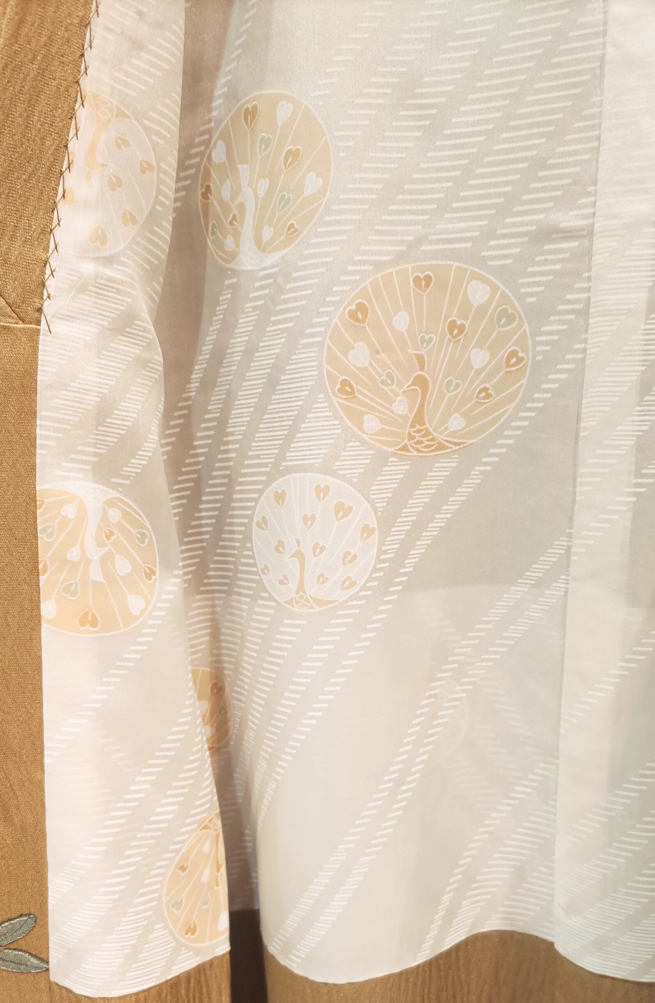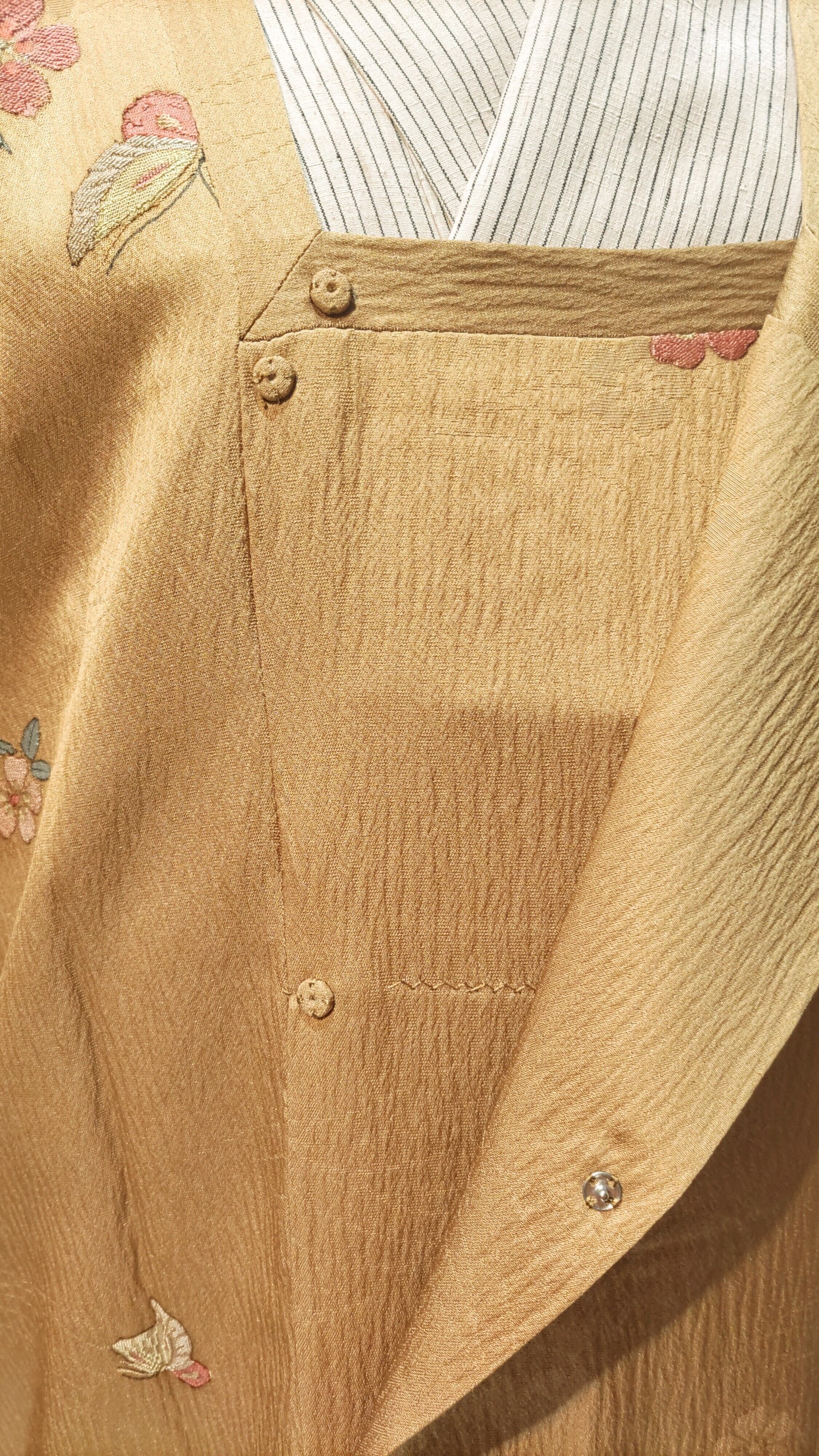 黄土色を淡く薄くしたようなベージュ色の地は、光が当たると光沢感からゴールド色にも見えます。