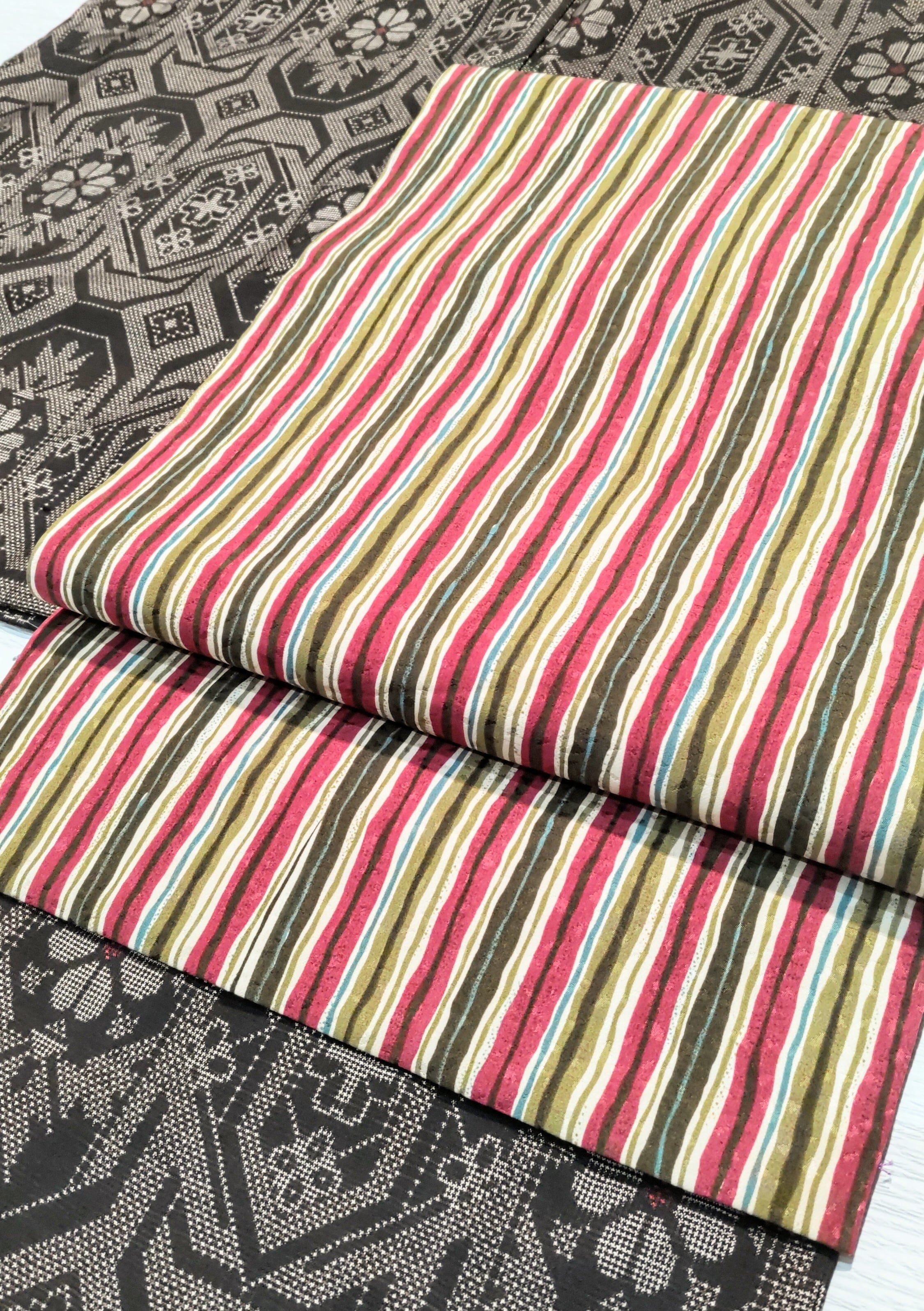 シンプルな縞柄ながら、抹茶色の濃淡、とても濃く暗い緑色に濃い緑青色、ラズベリーソースのようなピンク色に焦げ茶色の組み合わせが、個性的で遊び心も感じます。