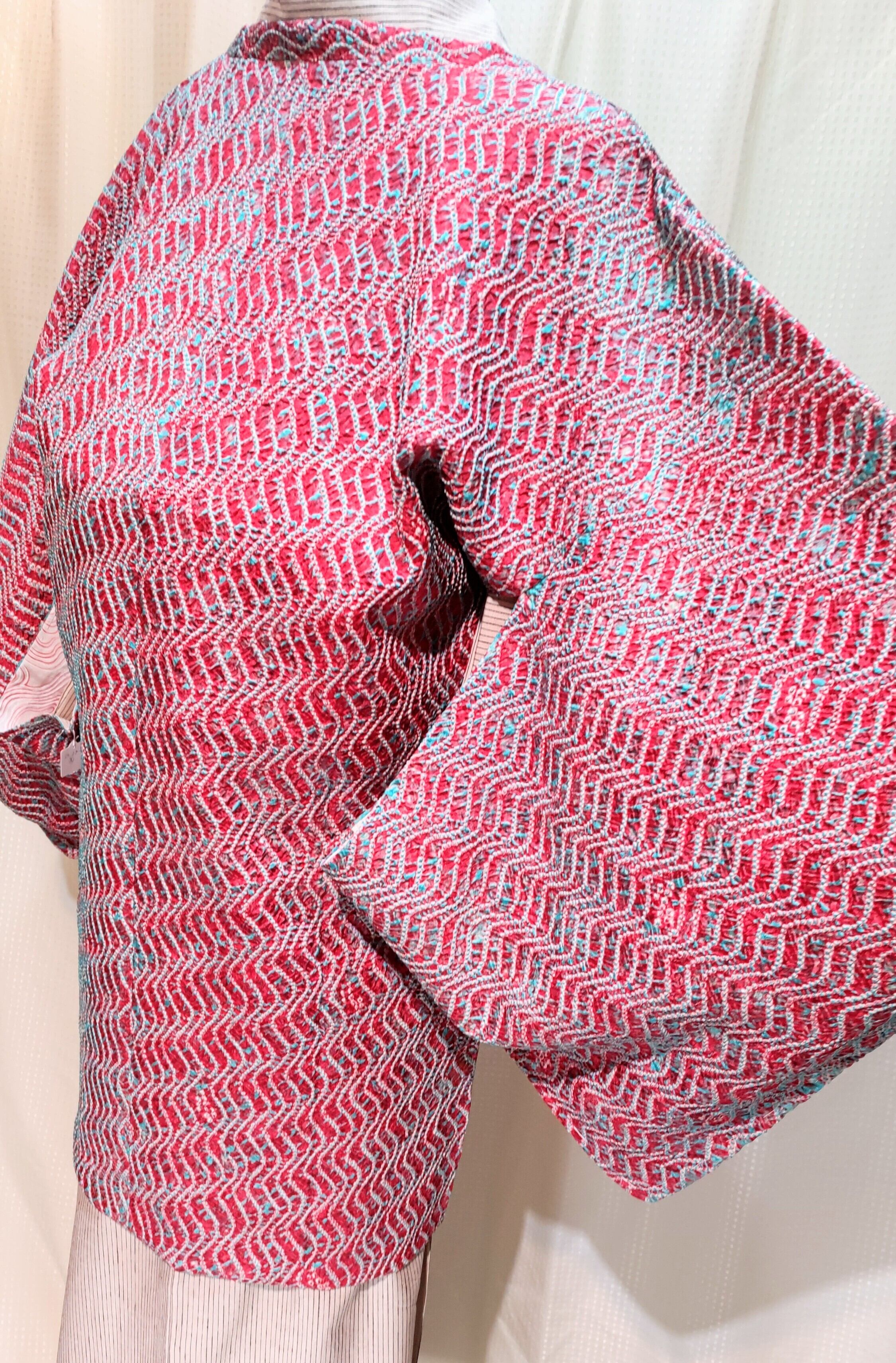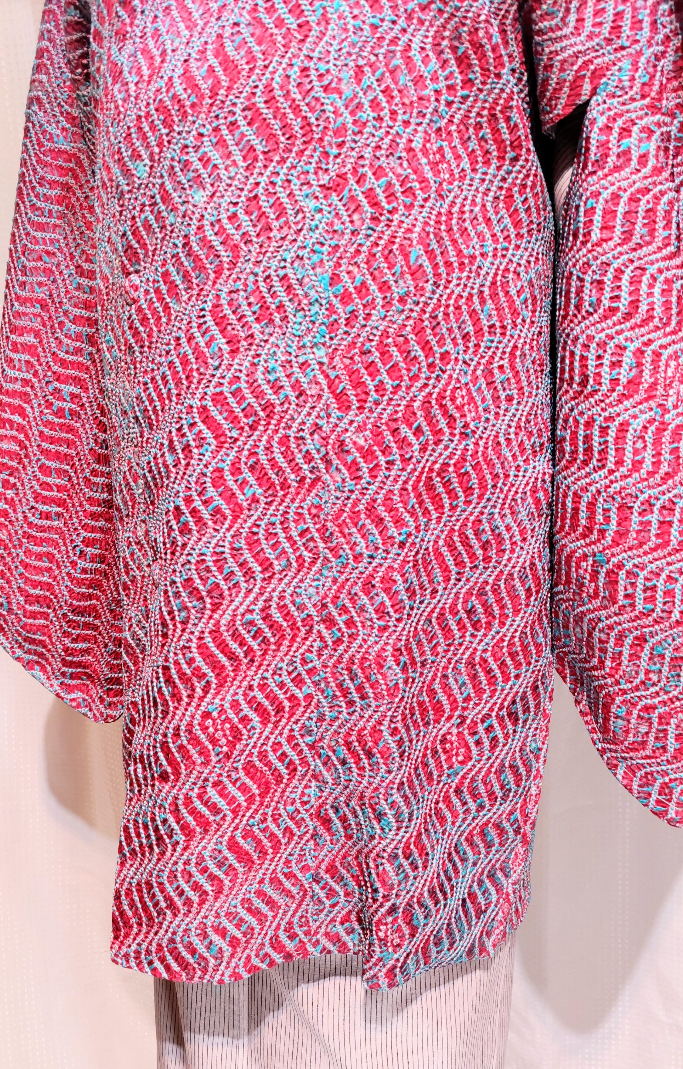 総絞りの道行き〜赤色に青色の個性派〜です。