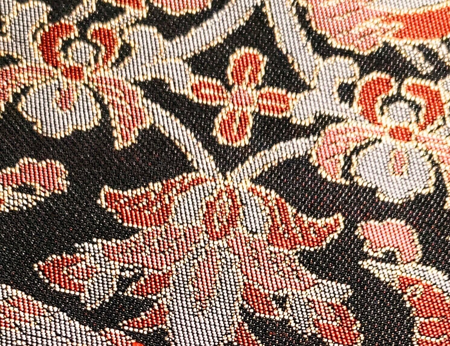 黒地にも控えめながらキラキラ輝く金糸が織り込まれており、また唐草花や鳥さんの輪郭は金縁になっています。