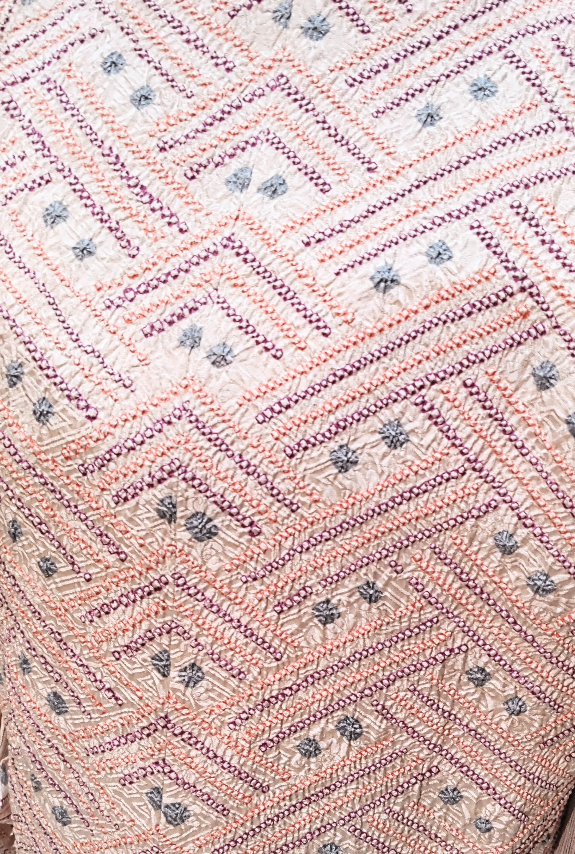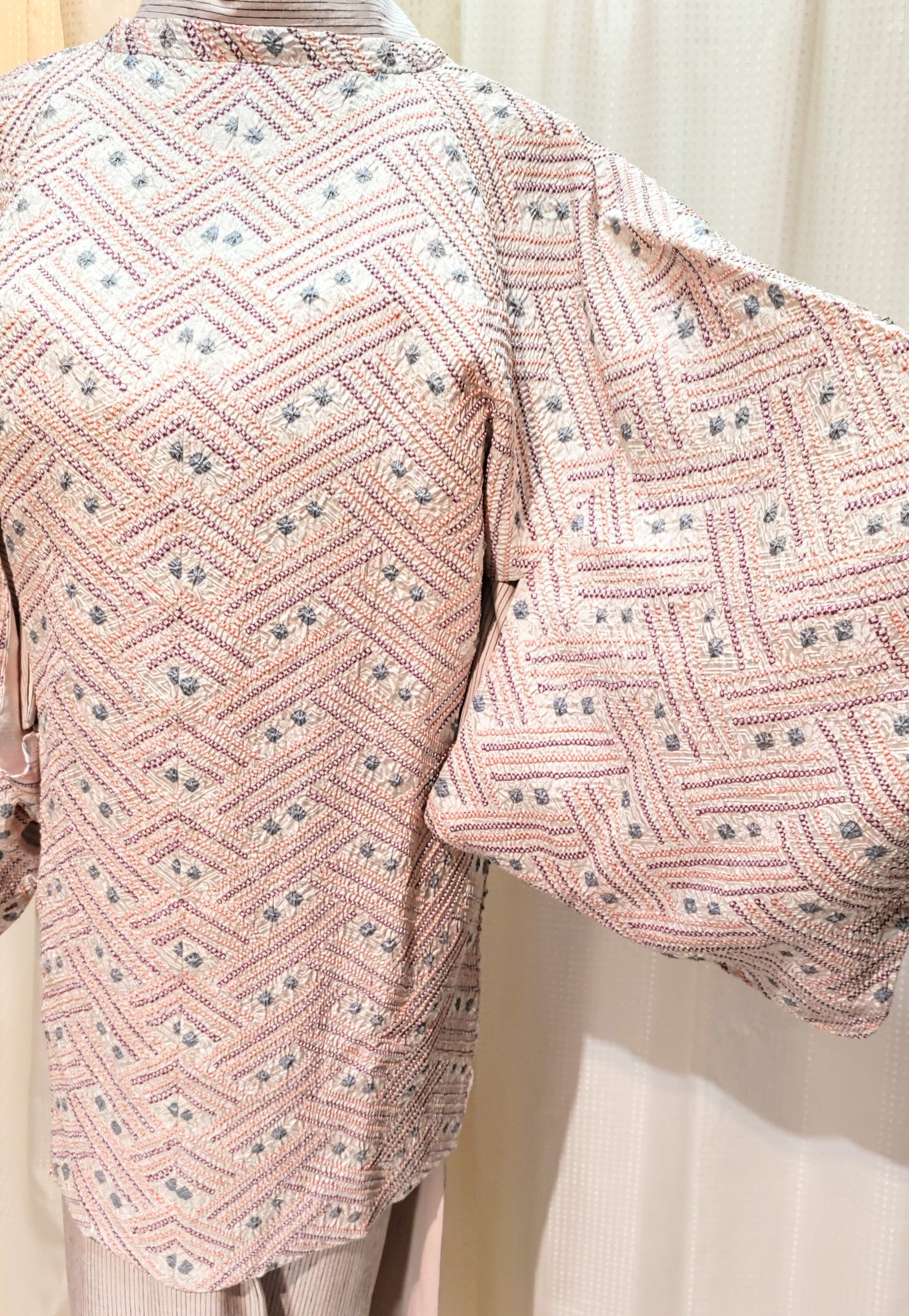 紗綾形とドットの絞り 道行き〜白地に紫色、淡い橙色、グレー~です。