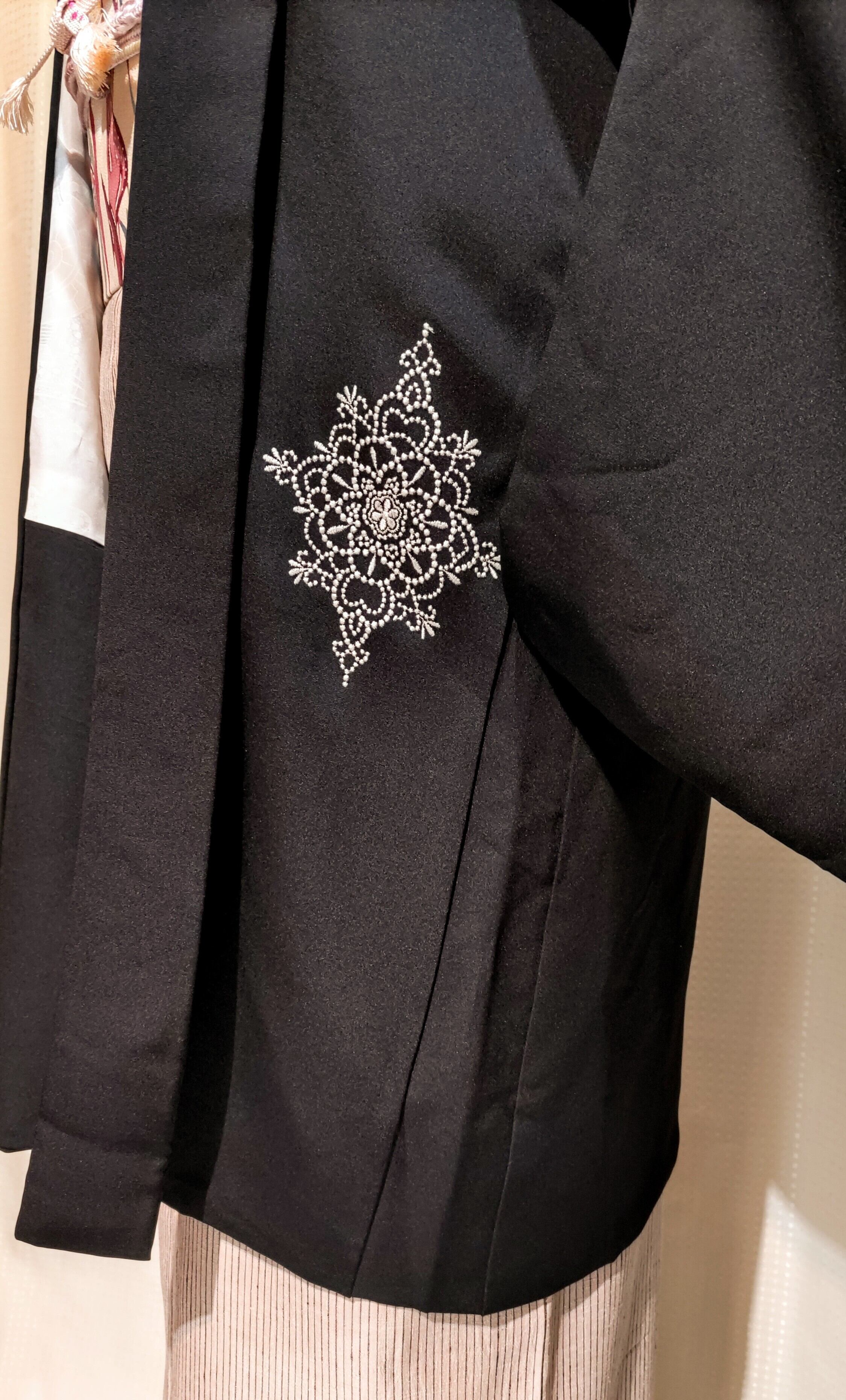 裄 約69cm 黒地に白色の刺繍 羽織〜レースモチーフのような柄〜