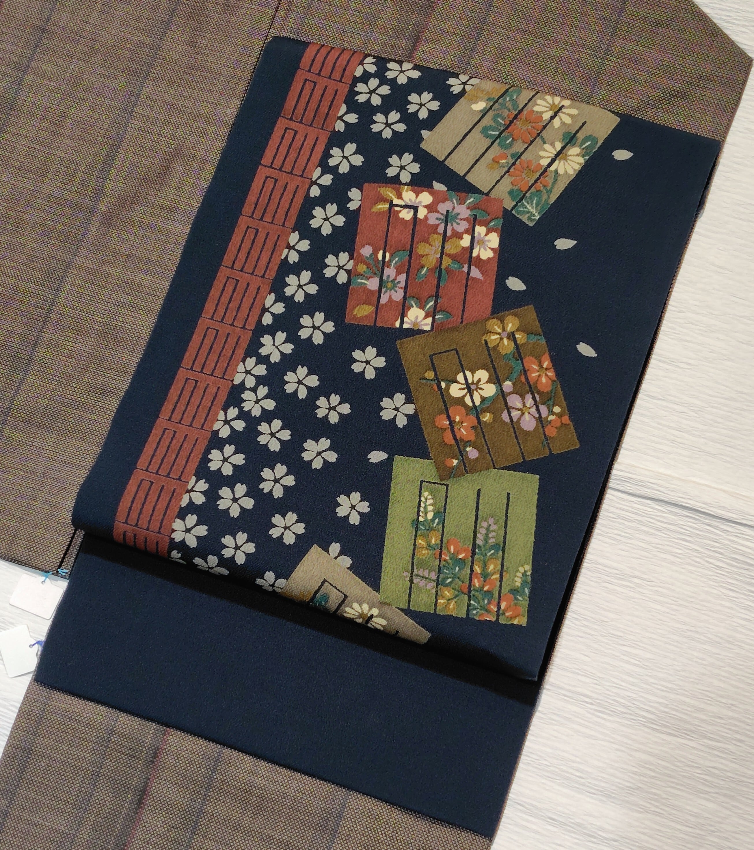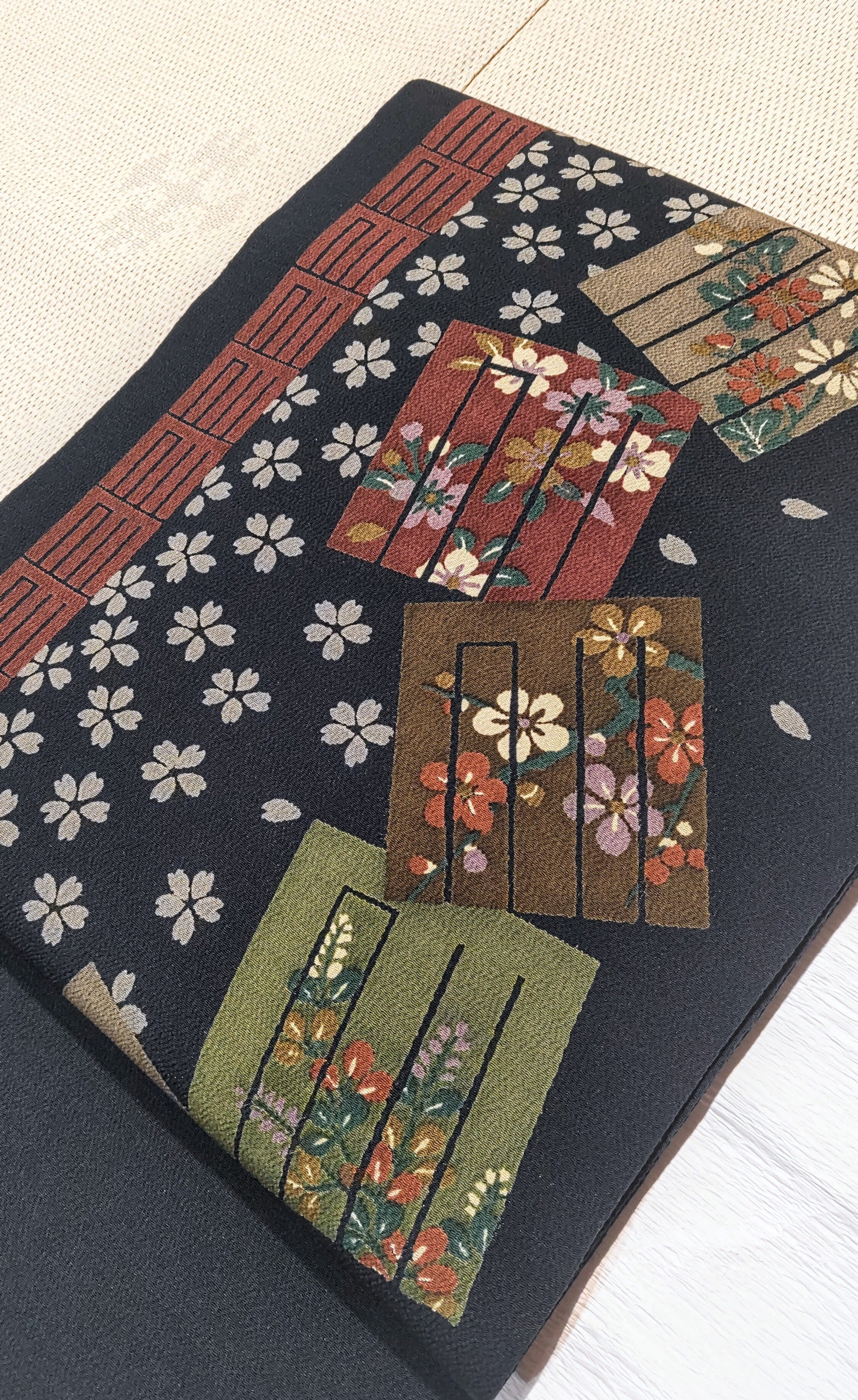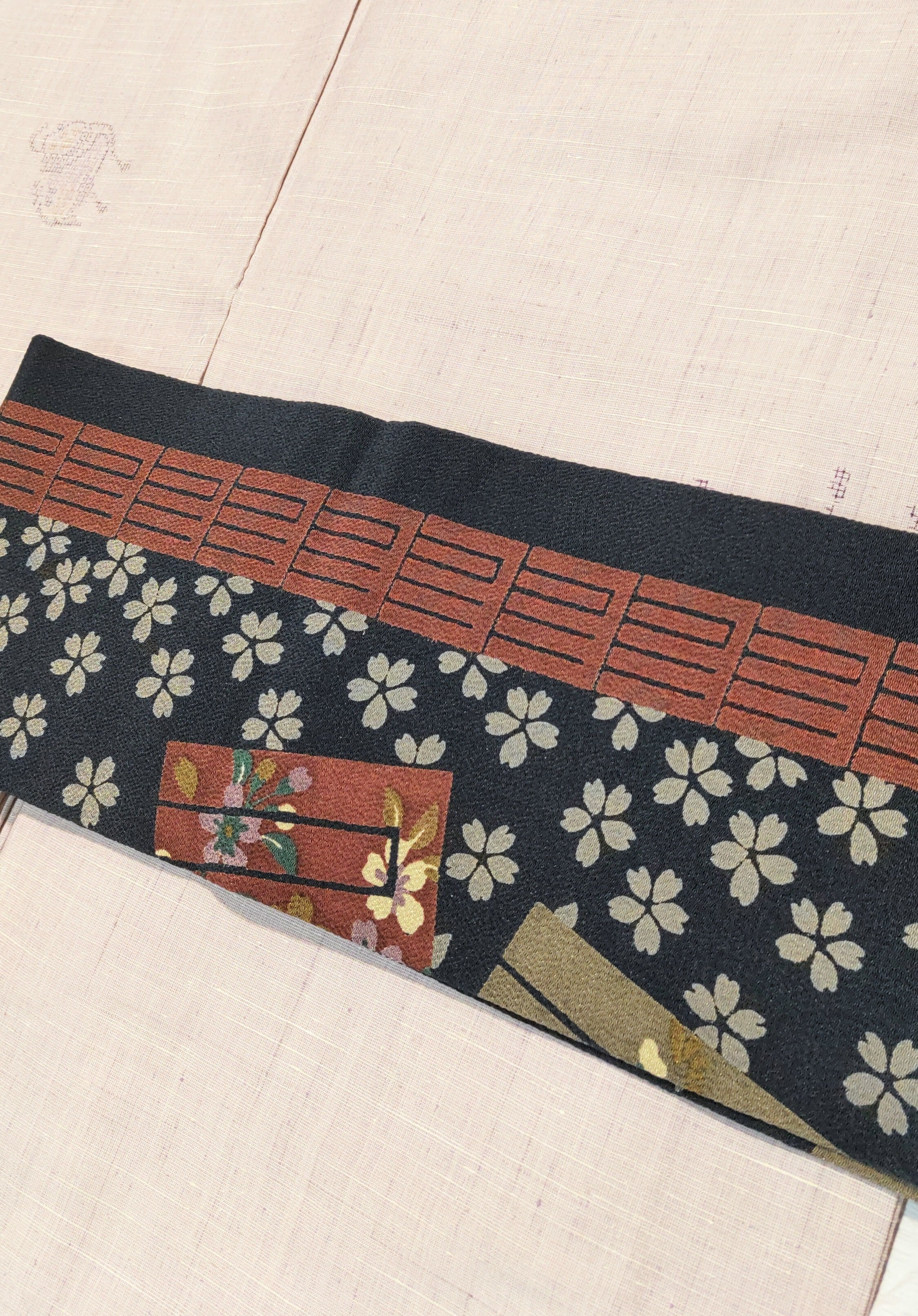そこに桜、梅、菊、萩柄と桜のシルエットの組み合わせが、美しくとても素敵な組み合わせです。