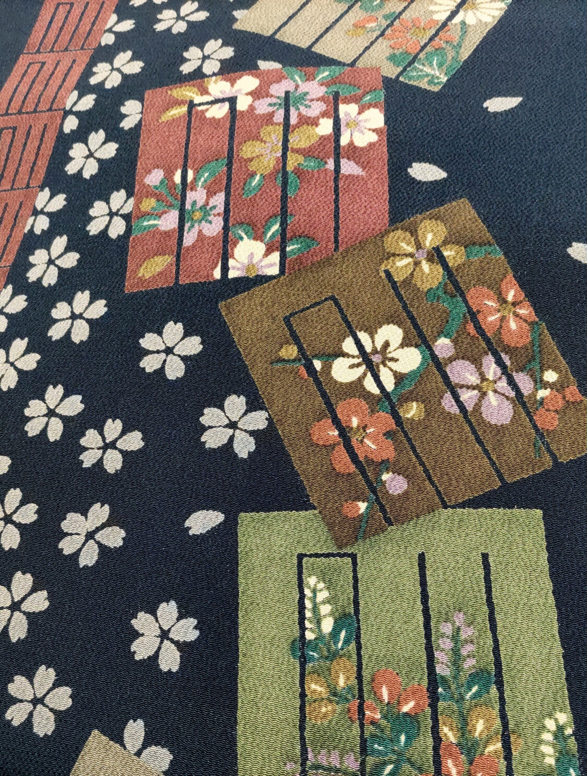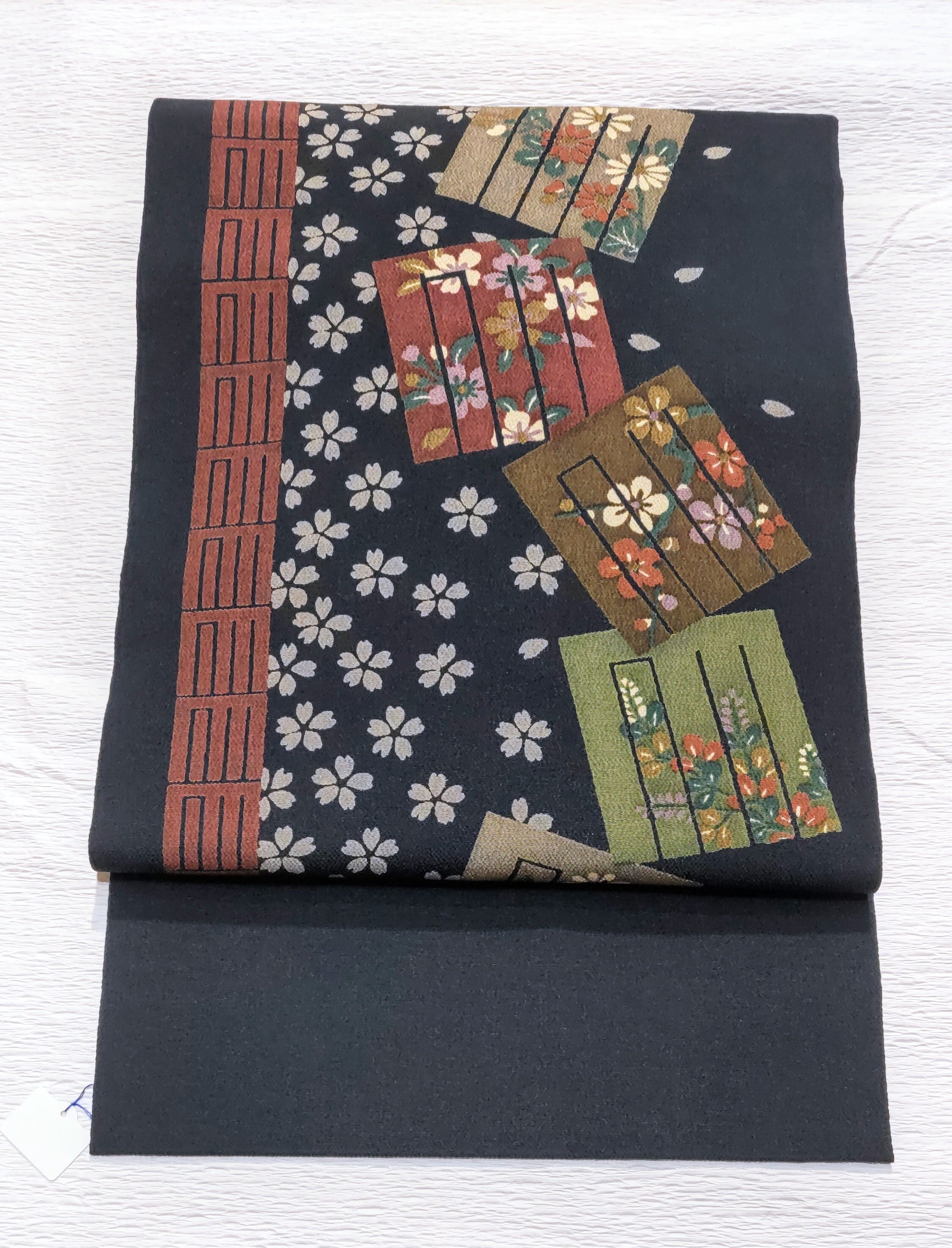 濃紺地に源氏香と桜、梅、菊、萩柄の縮緬地 名古屋帯