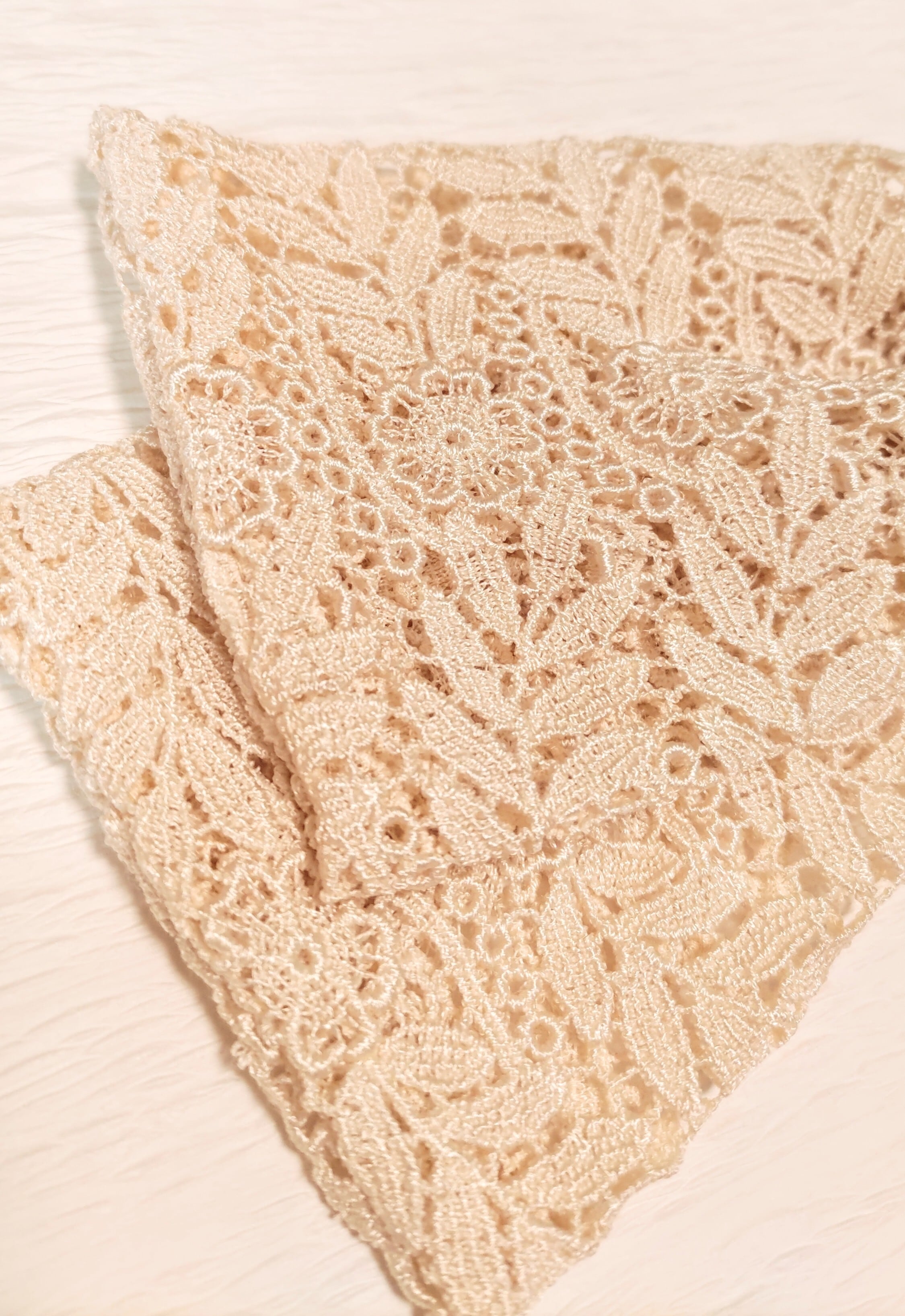 こちらの商品はヴィンテージのレース生地を使用した作品のため、なるべく綺麗な部分を使用しておりますが、多少のくすみ、染めムラ、生地の痛みなどがある場合もごさいます。