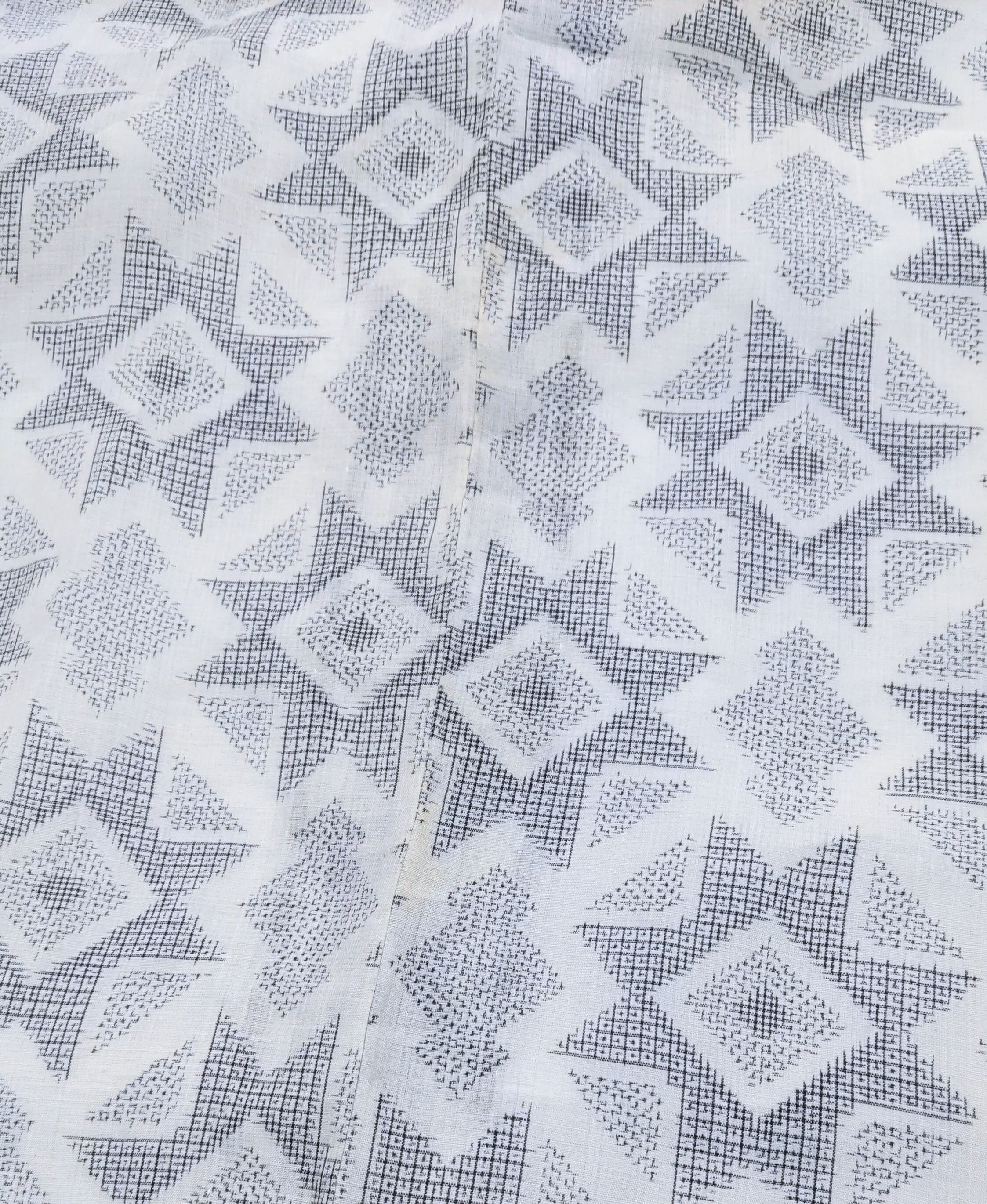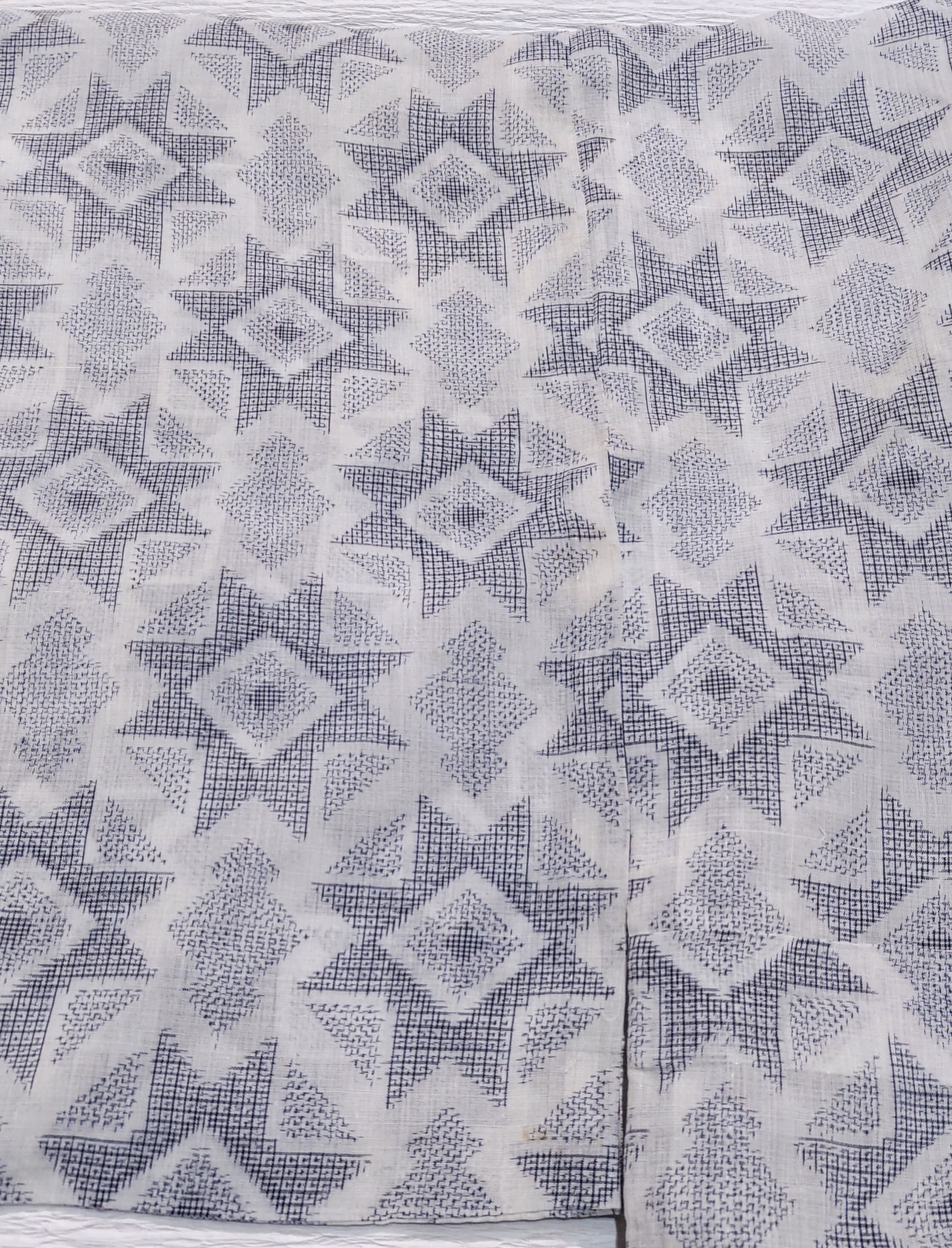 白地に青色と黒色で絣模様、異国情緒を感じるような柄ですが、菱形と四角形の組み合わせ。