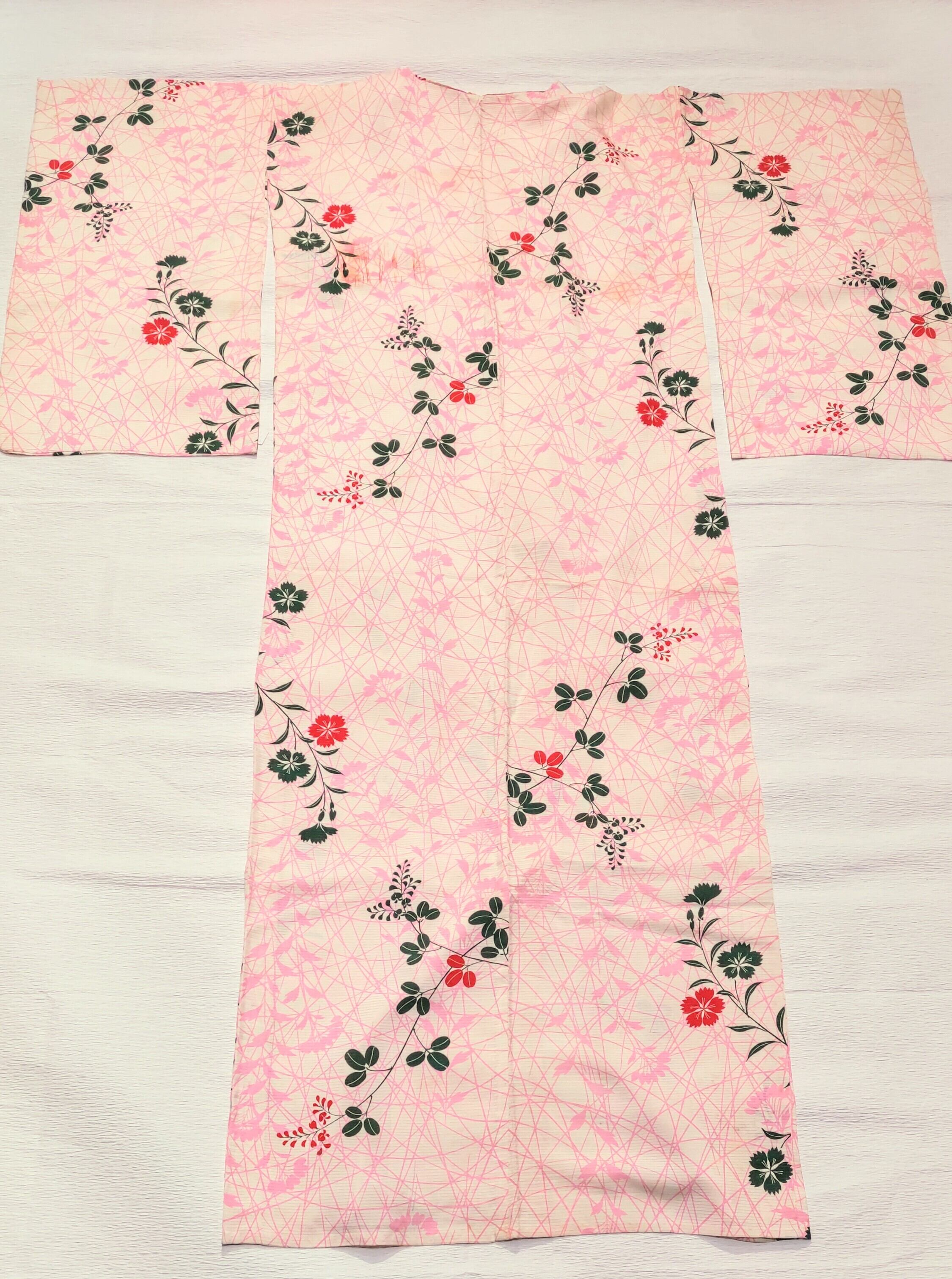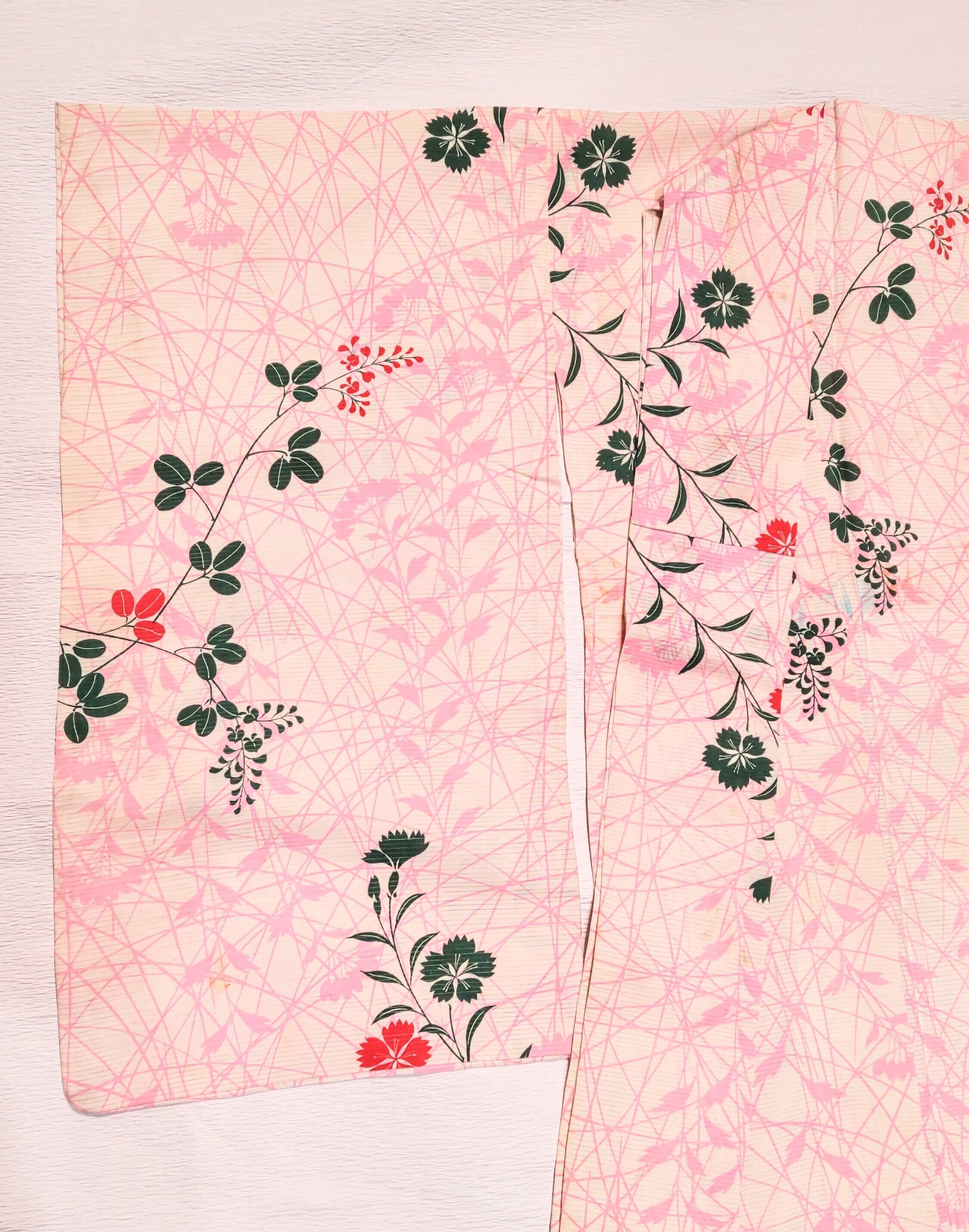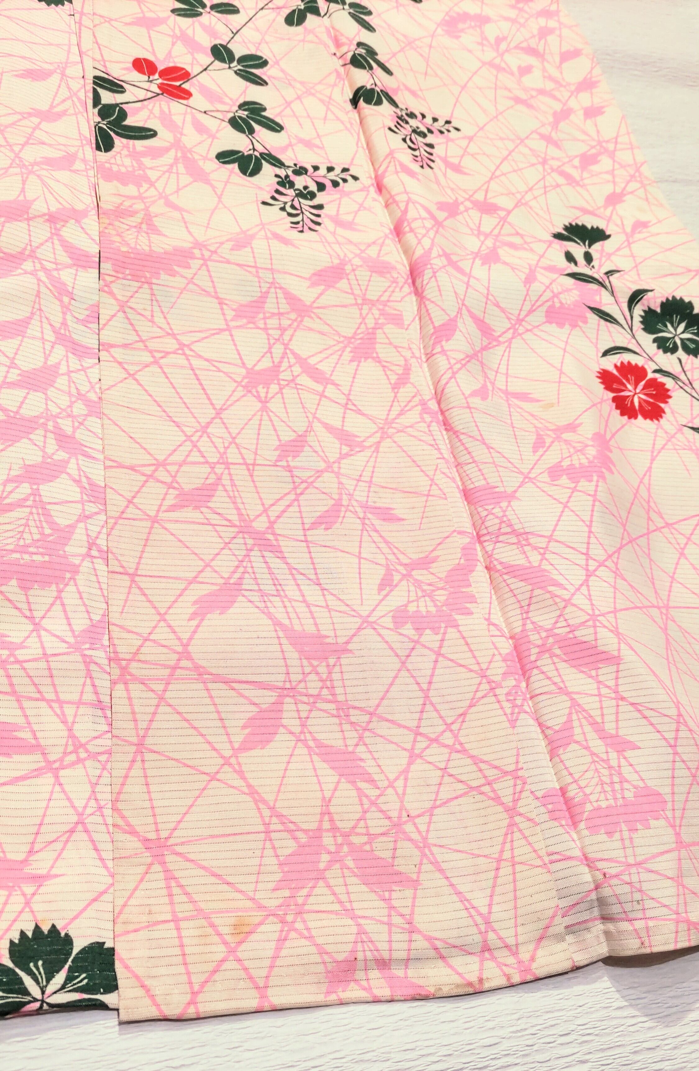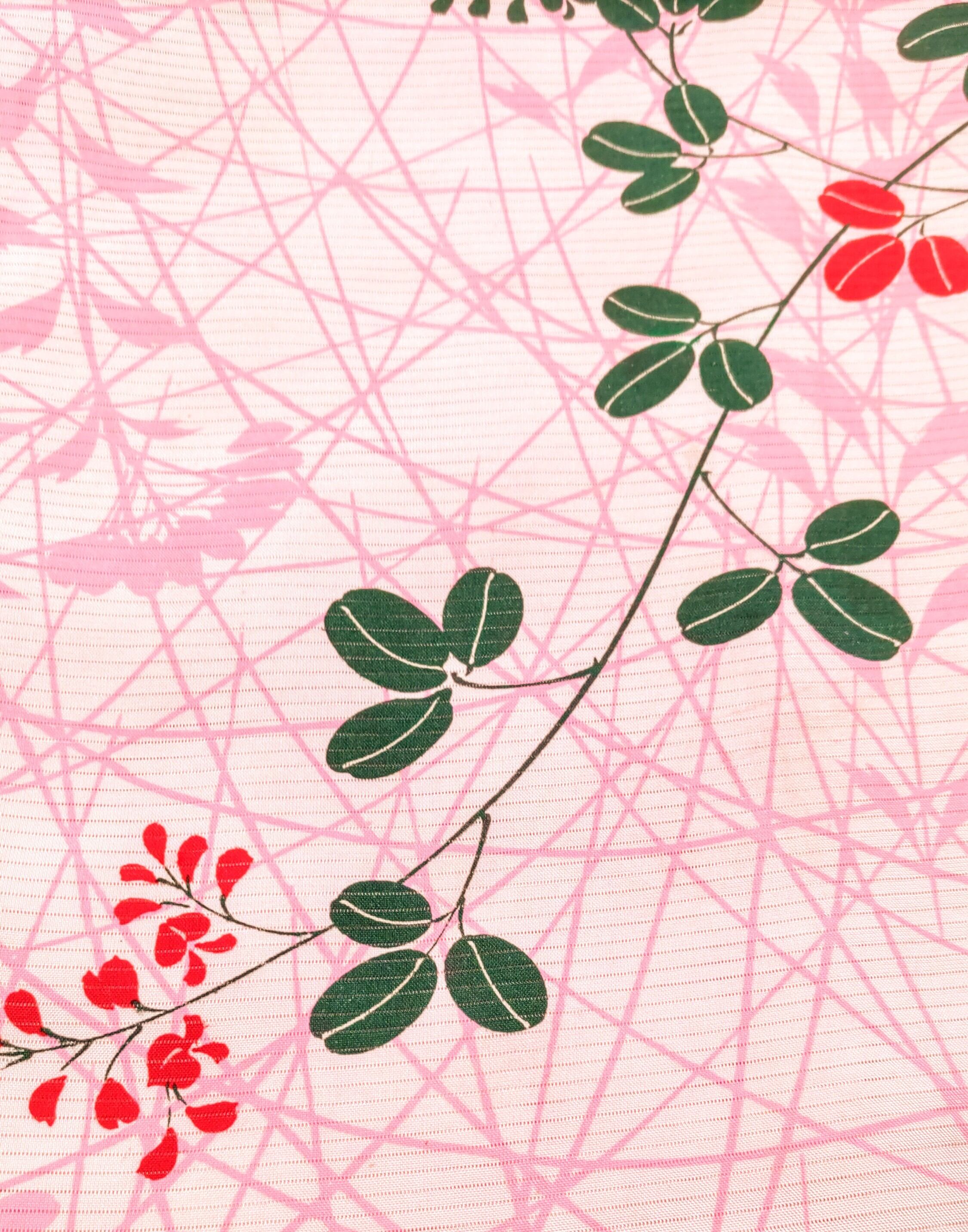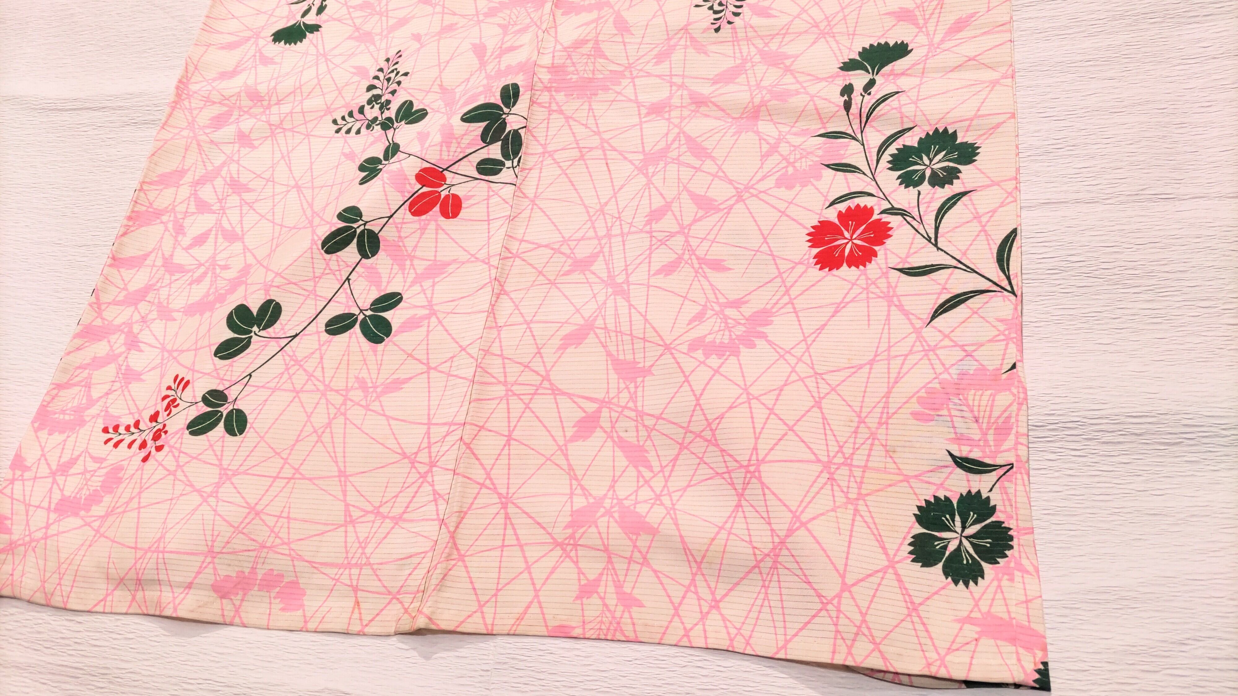 白地にピンク色と緑色と赤色で撫子、萩などの夏〜秋の草花が染められています。