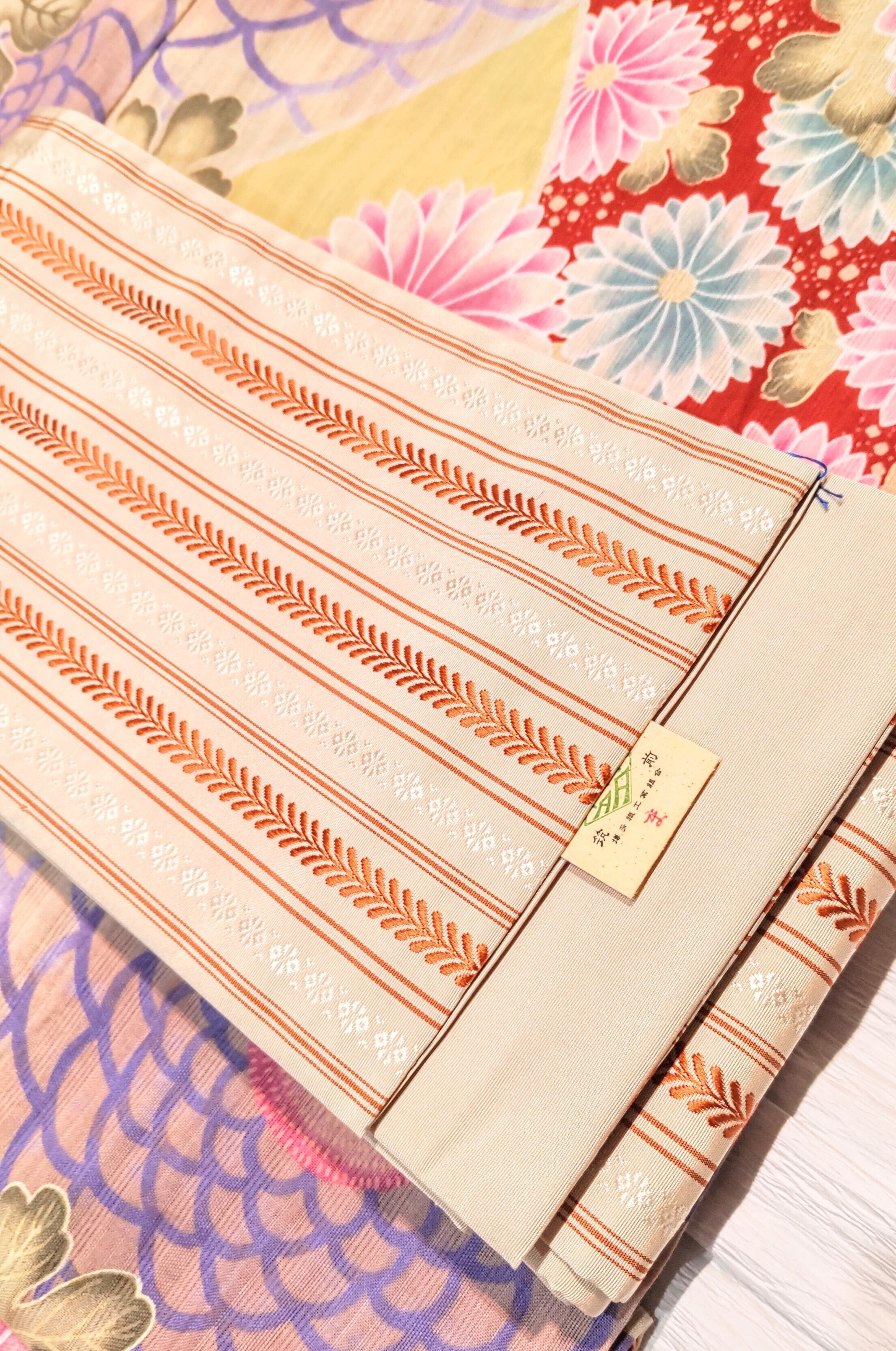 少し灰色よりの落ち着いた白地に橙色が、すっきりとしていて粋な半幅帯です。