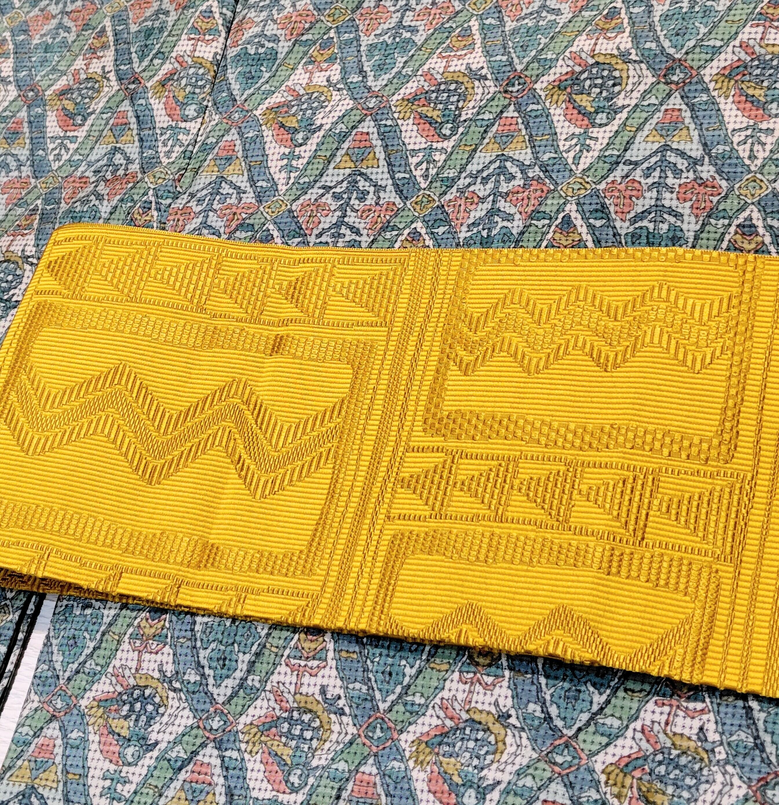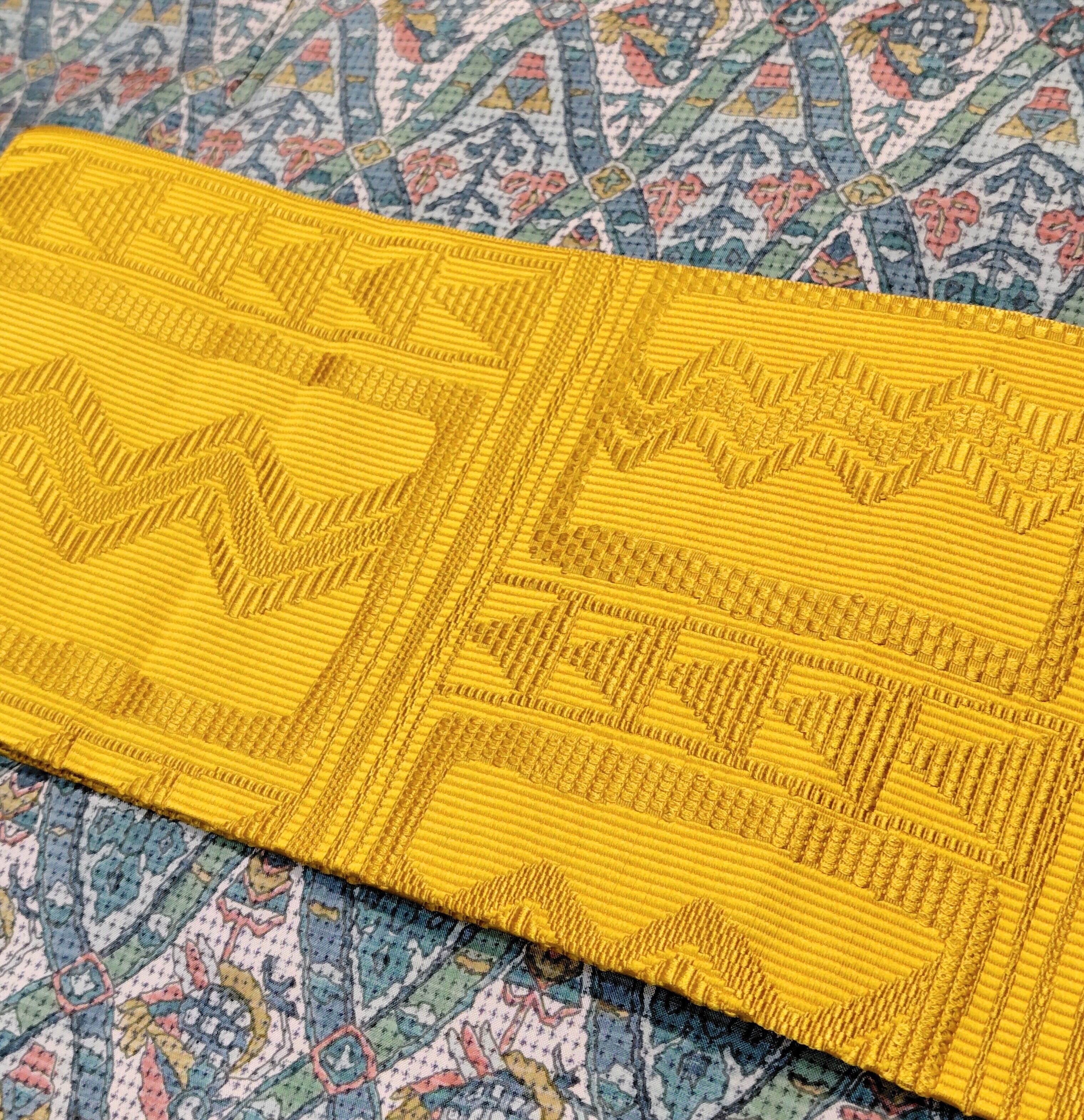 黄色に幾何学模様柄 博多織の名古屋帯です。