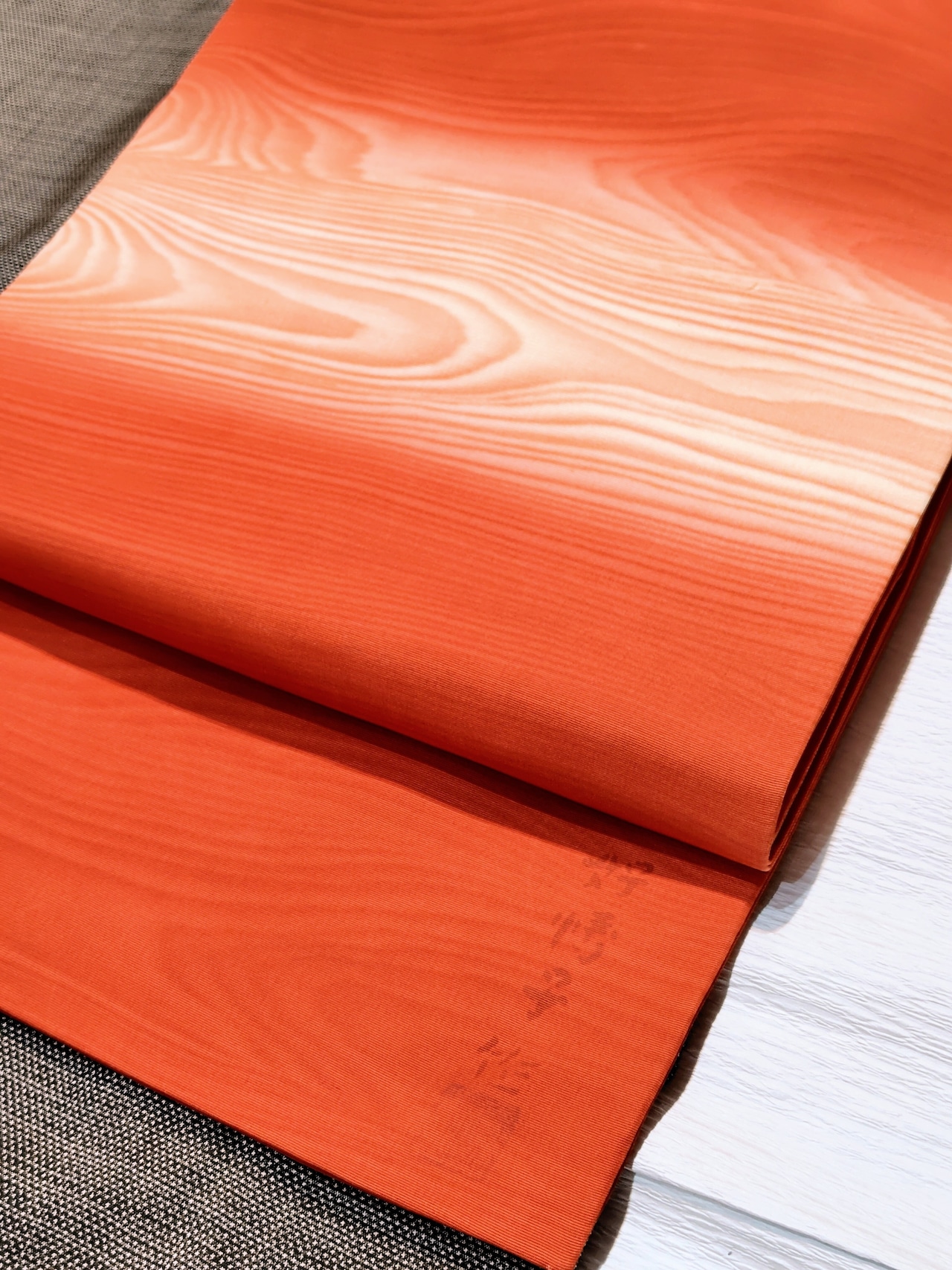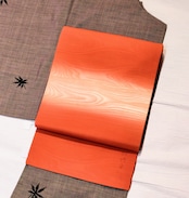 塩瀬の生地に淡い橙色系に少し茶色を足したような、明るさとシックさのバランスがよい上品なお色、とても美しい帯です。