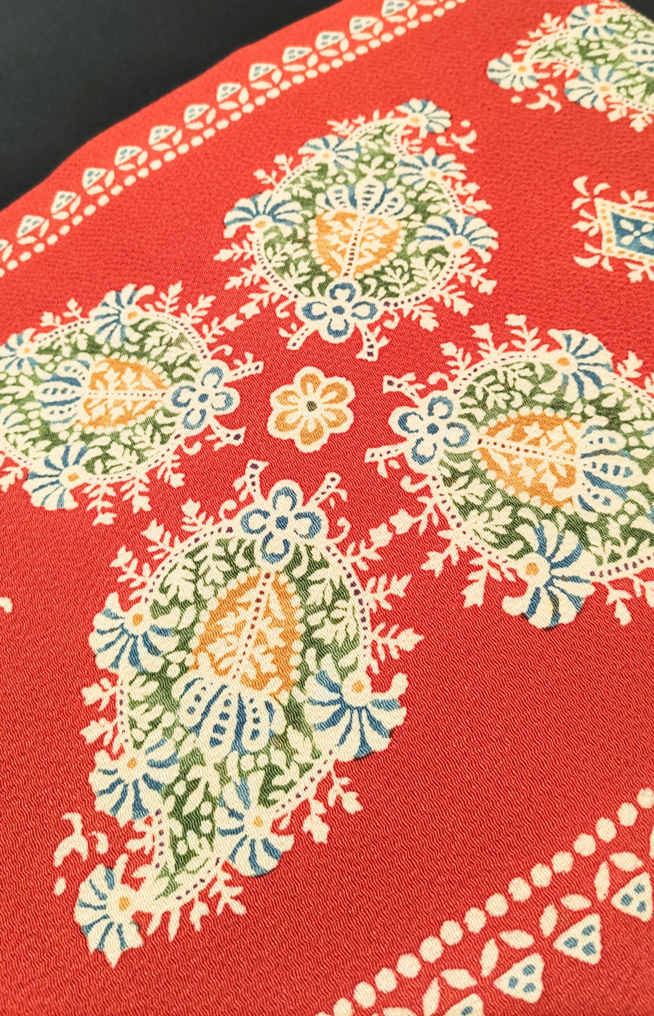 赤色の地にペイズリー柄 型染めの名古屋帯