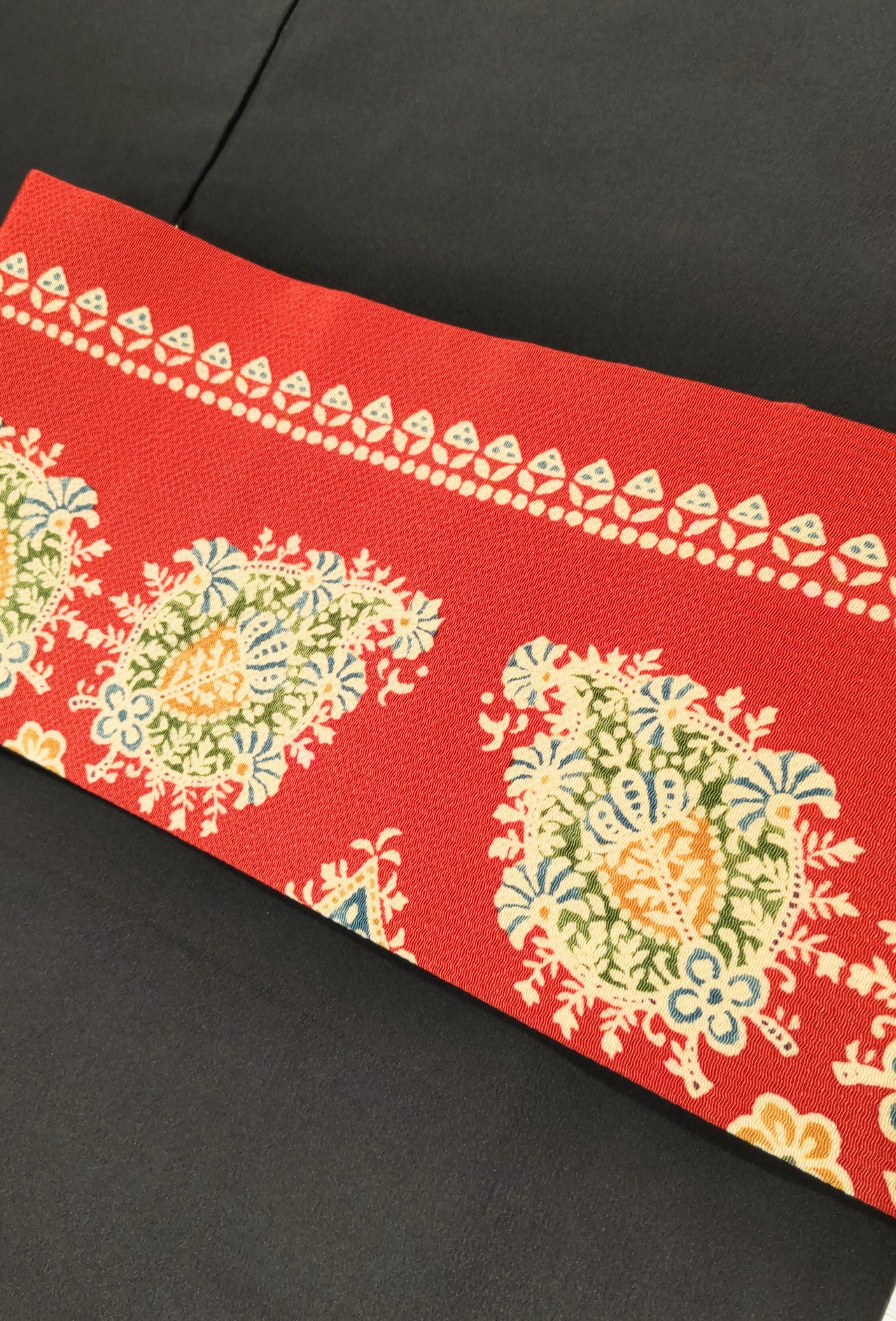 赤色の地にペイズリー柄の型染めの名古屋帯です。
