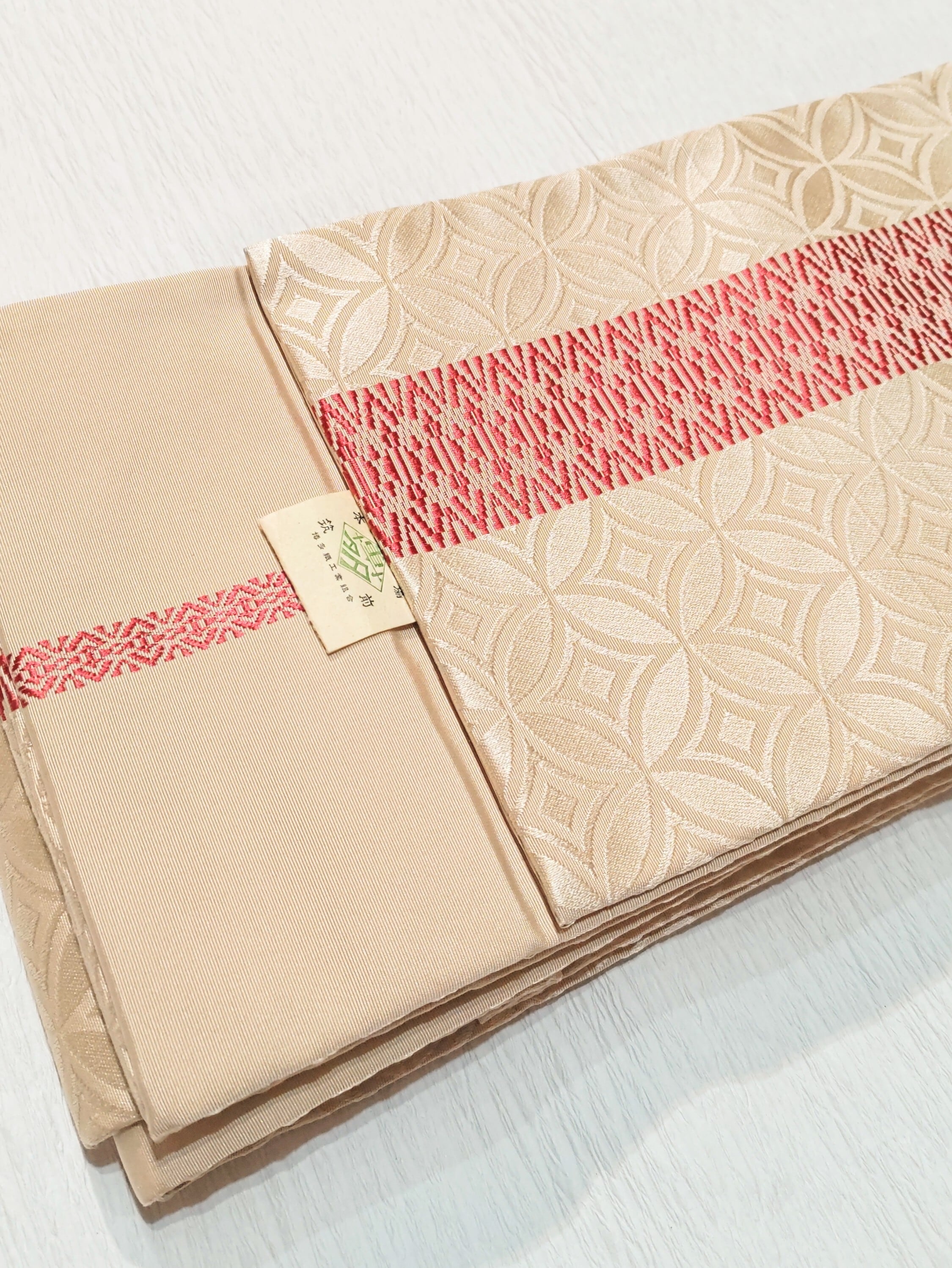 淡い生成り色の地に淡い赤色 七宝繋の地紋の博多織半幅帯