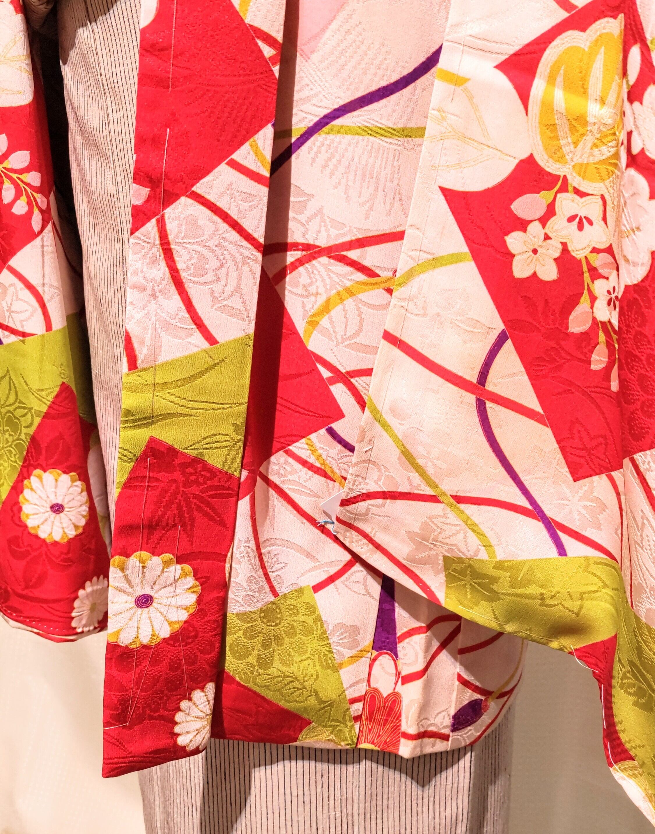 流水文様のように流れ舞うような紐が優美で、まるで千代紙のように華やかで可愛いアンティークの羽織です。