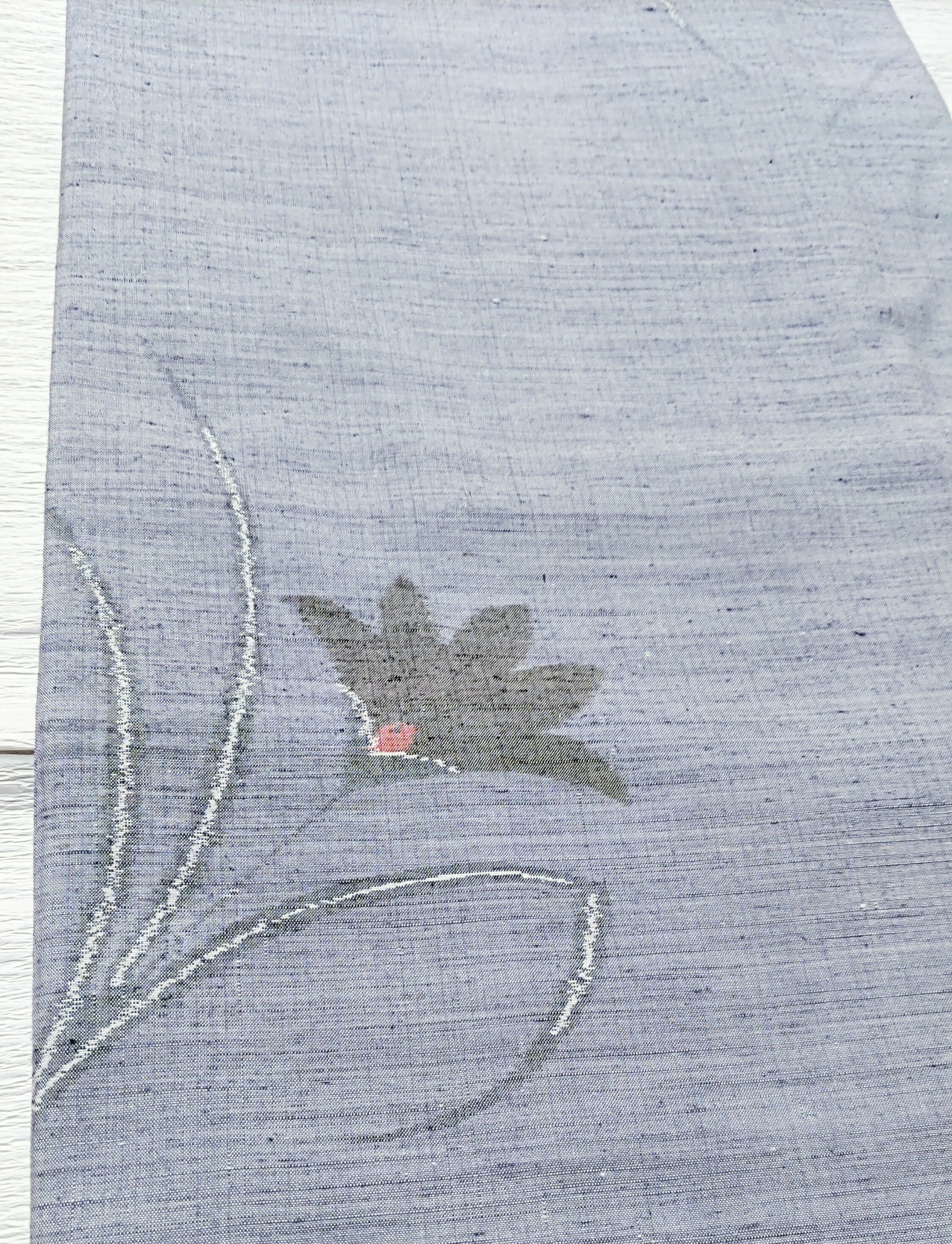 くすんだ水色のようにも、淡く薄いブルーグレーにも見える地に、抽象的な黒色のお花が美しく映える紬。