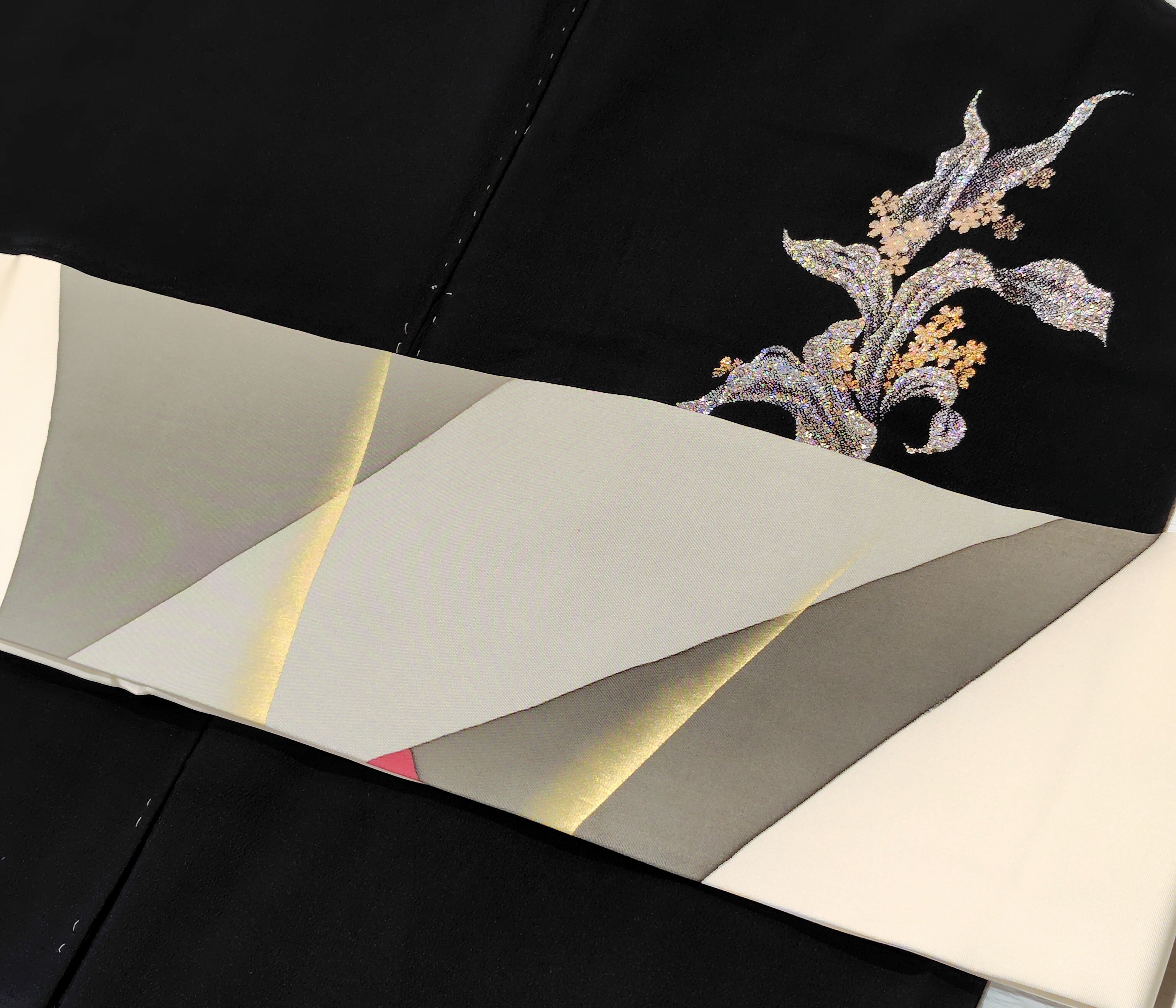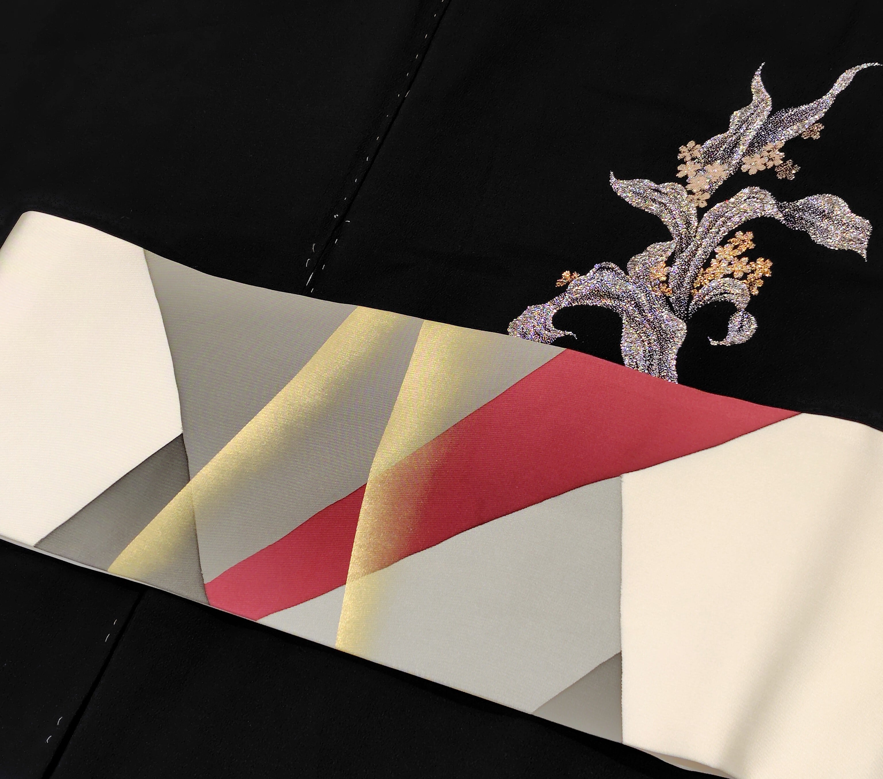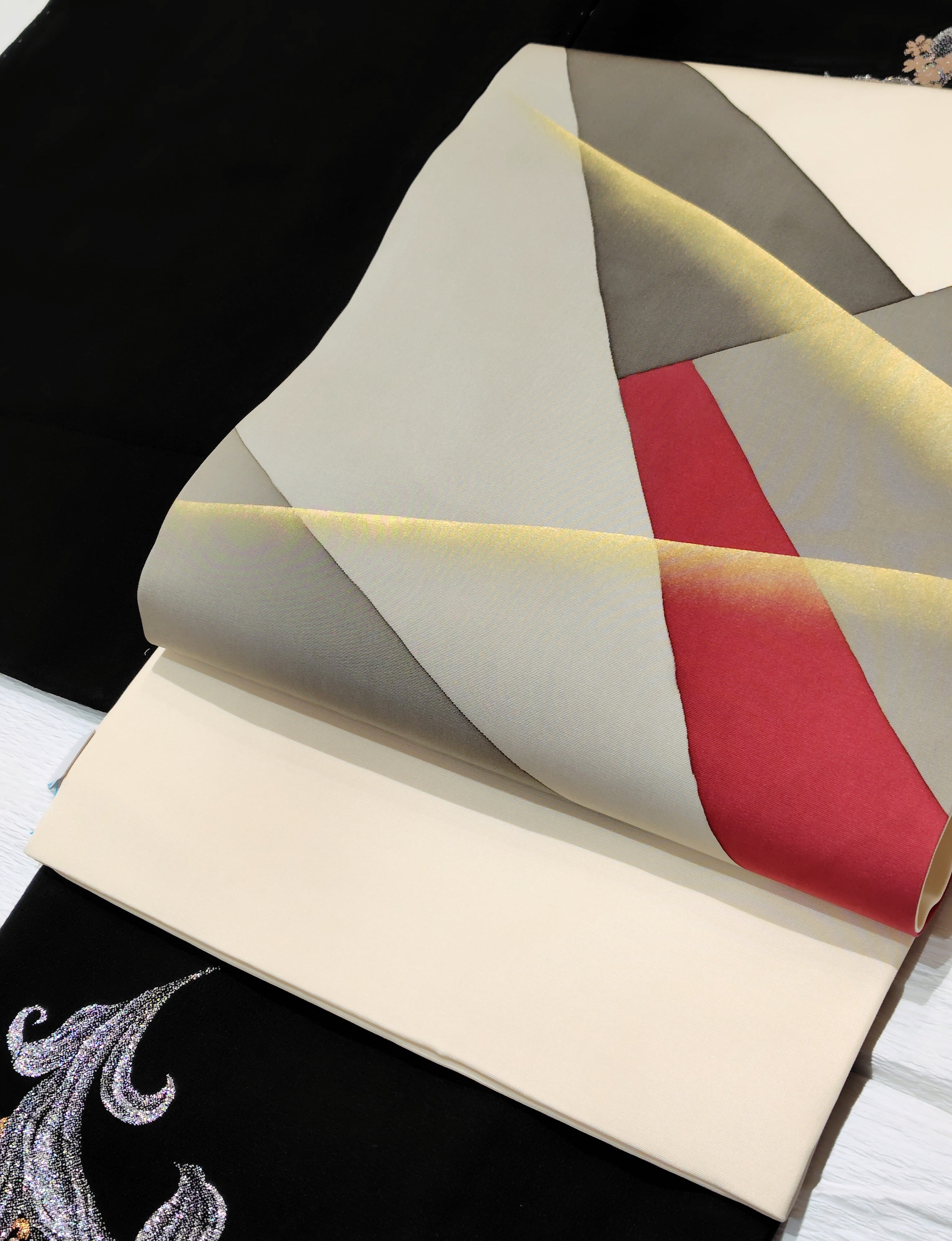 絹の柔らかな白地に、グレーの濃淡、臙脂色に金粉で流れるような線の組み合わせが、とてもスタイリッシュなデザインです。
