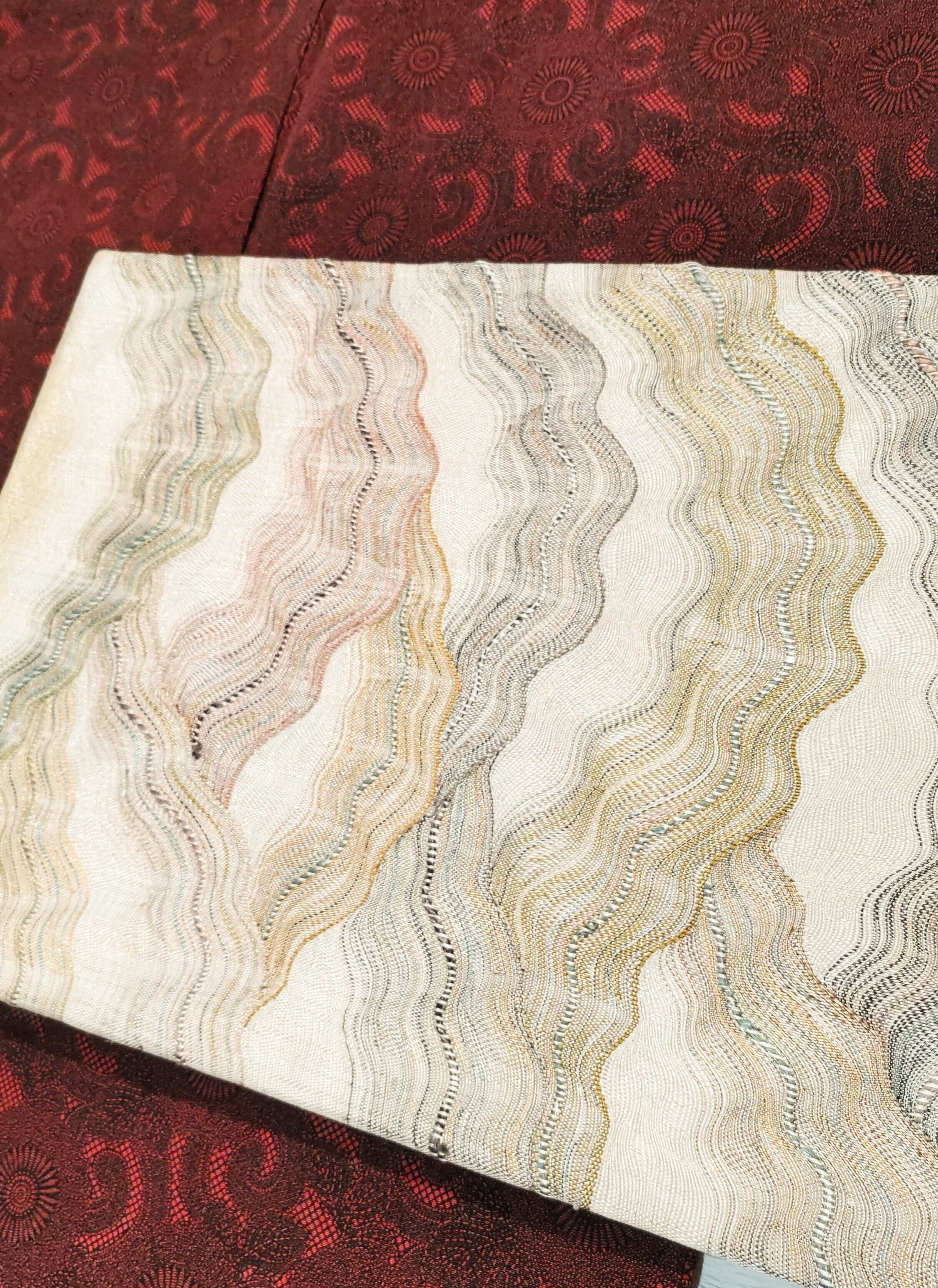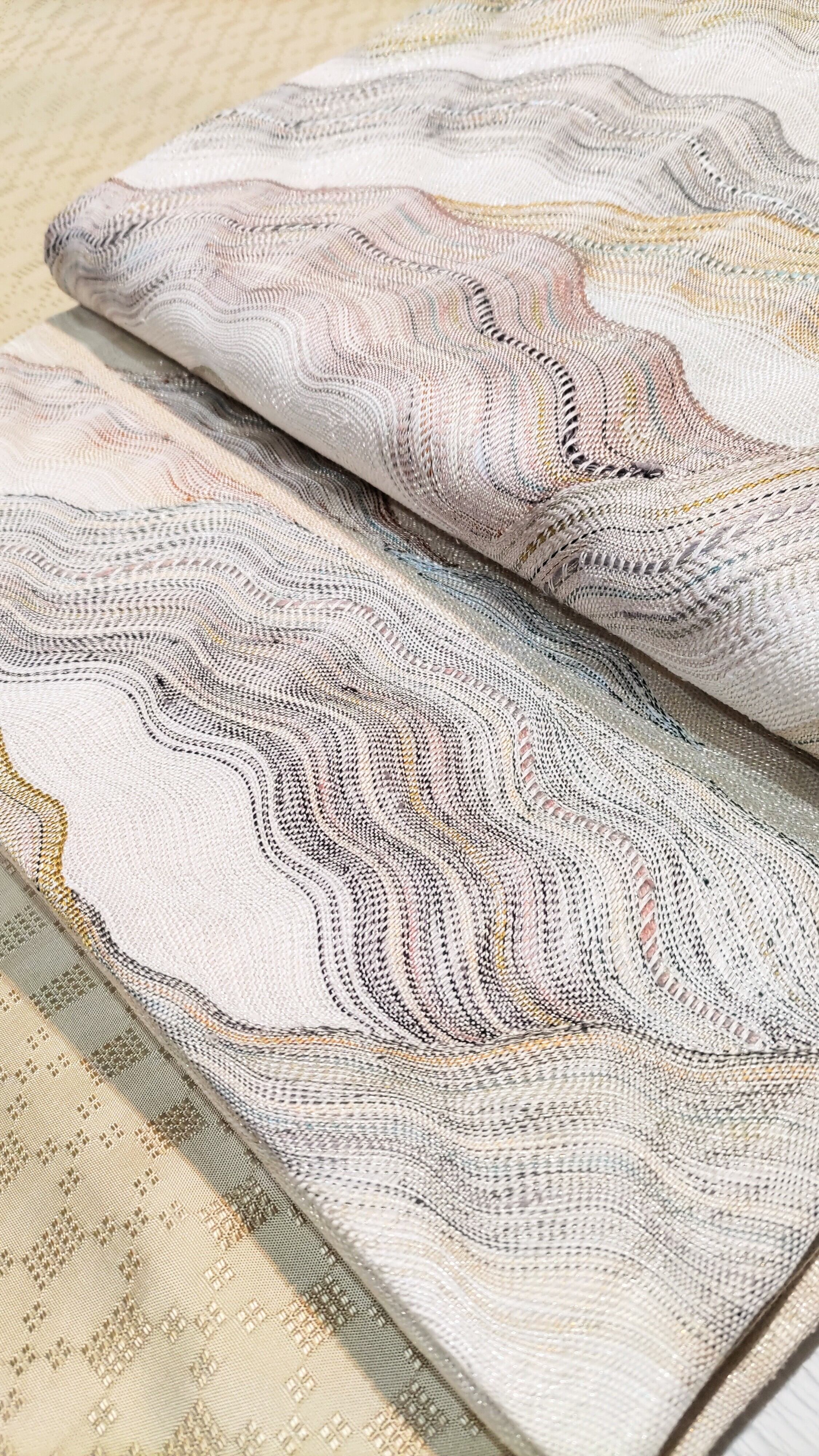 すくい織で波模様のような独特の柄と、モール織りのような、まるっとした不思議な織の組み合わせで、とてもお洒落な帯になっています。