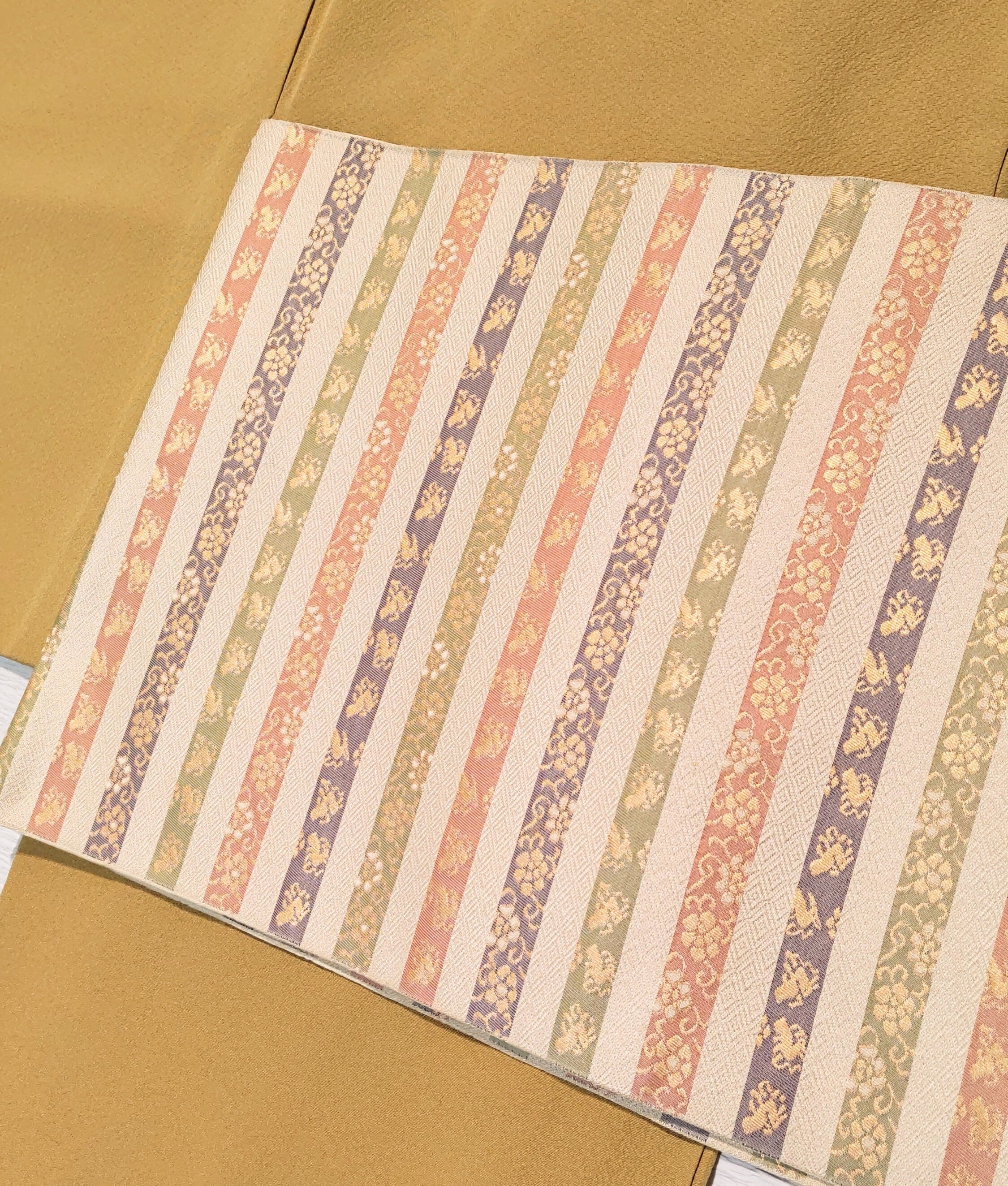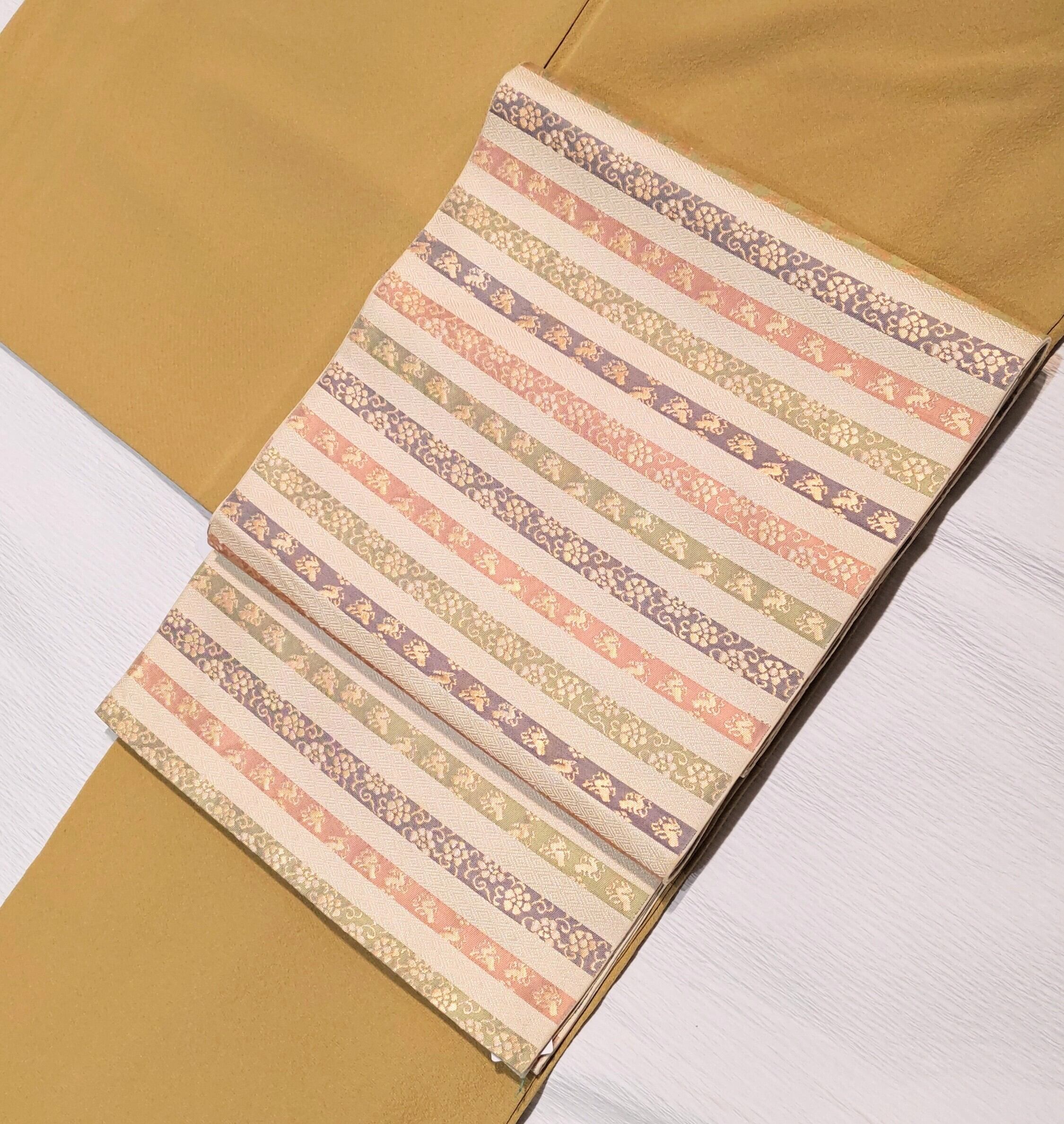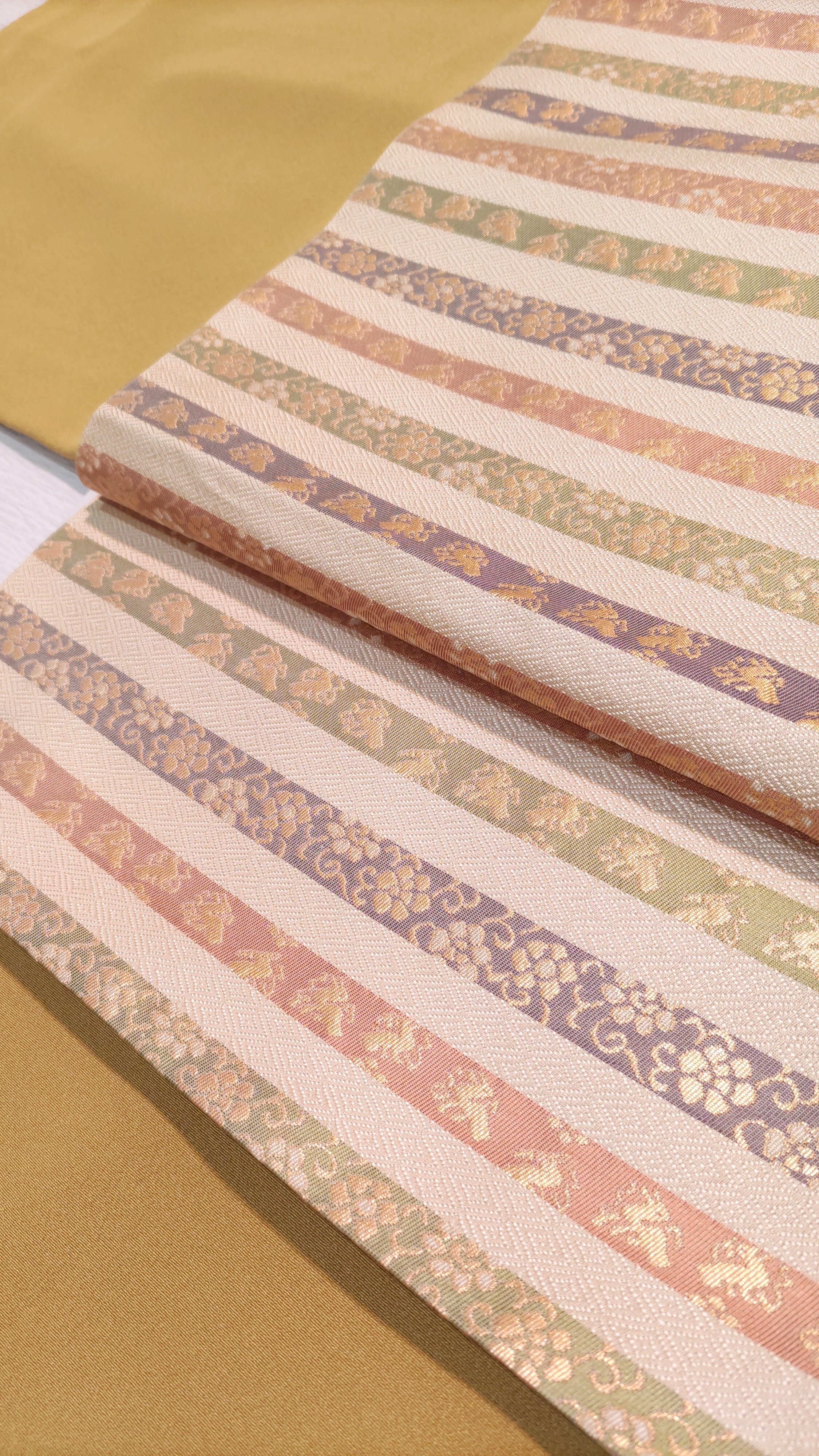 生成り地に薄めの緑色、青よりの紫色、ベージュピンク色の細い段(ボーダー柄)の中に金糸で蔦唐草花柄、花兎文様。