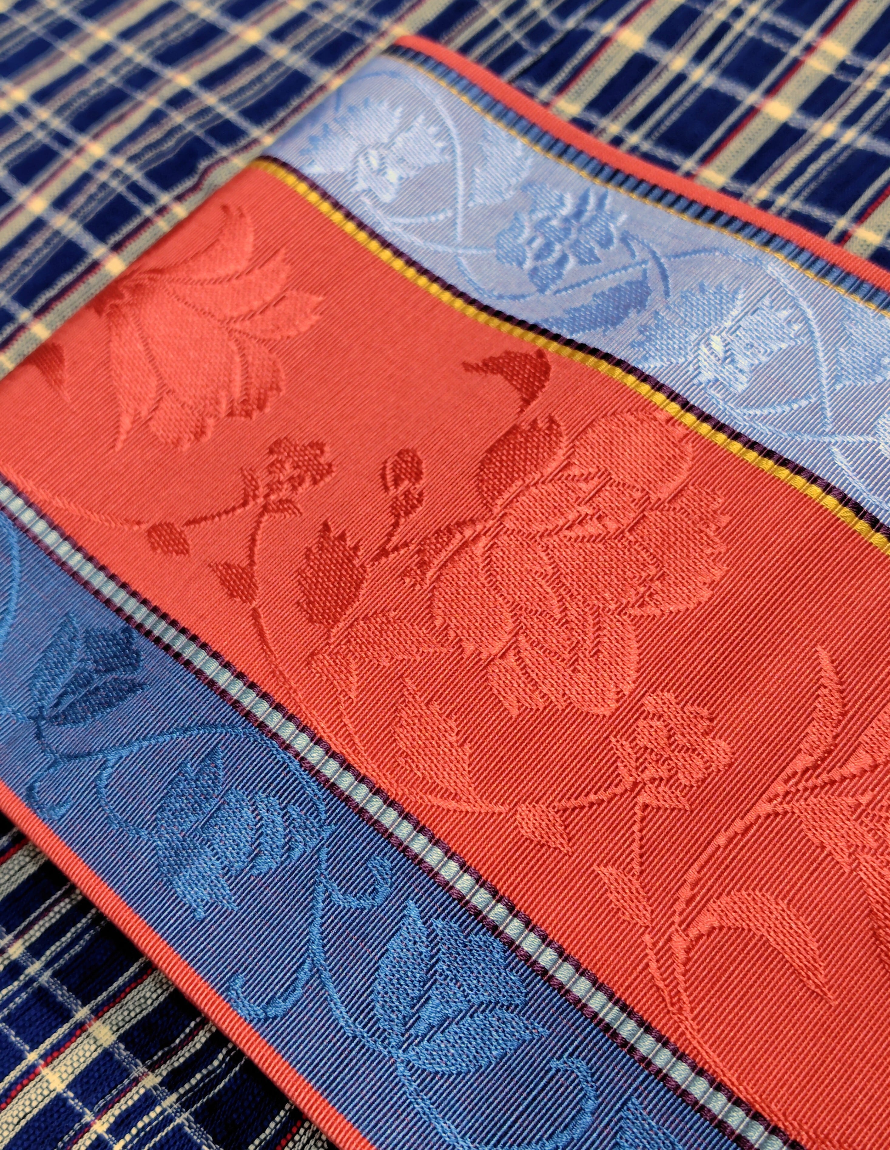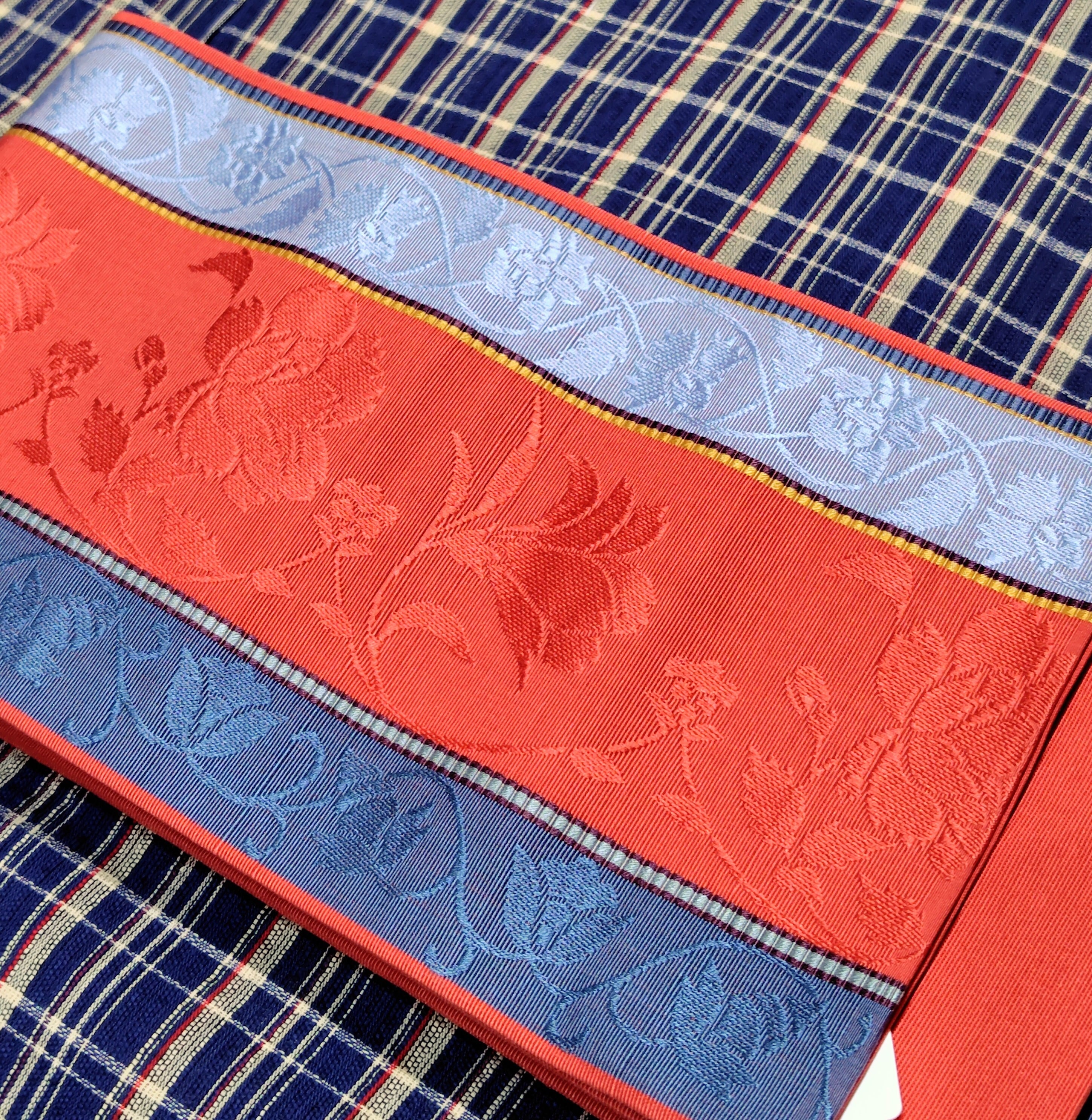 朱色よりの赤色に、くすんだ藍のような青色と水色の組み合わせが個性的な帯です。