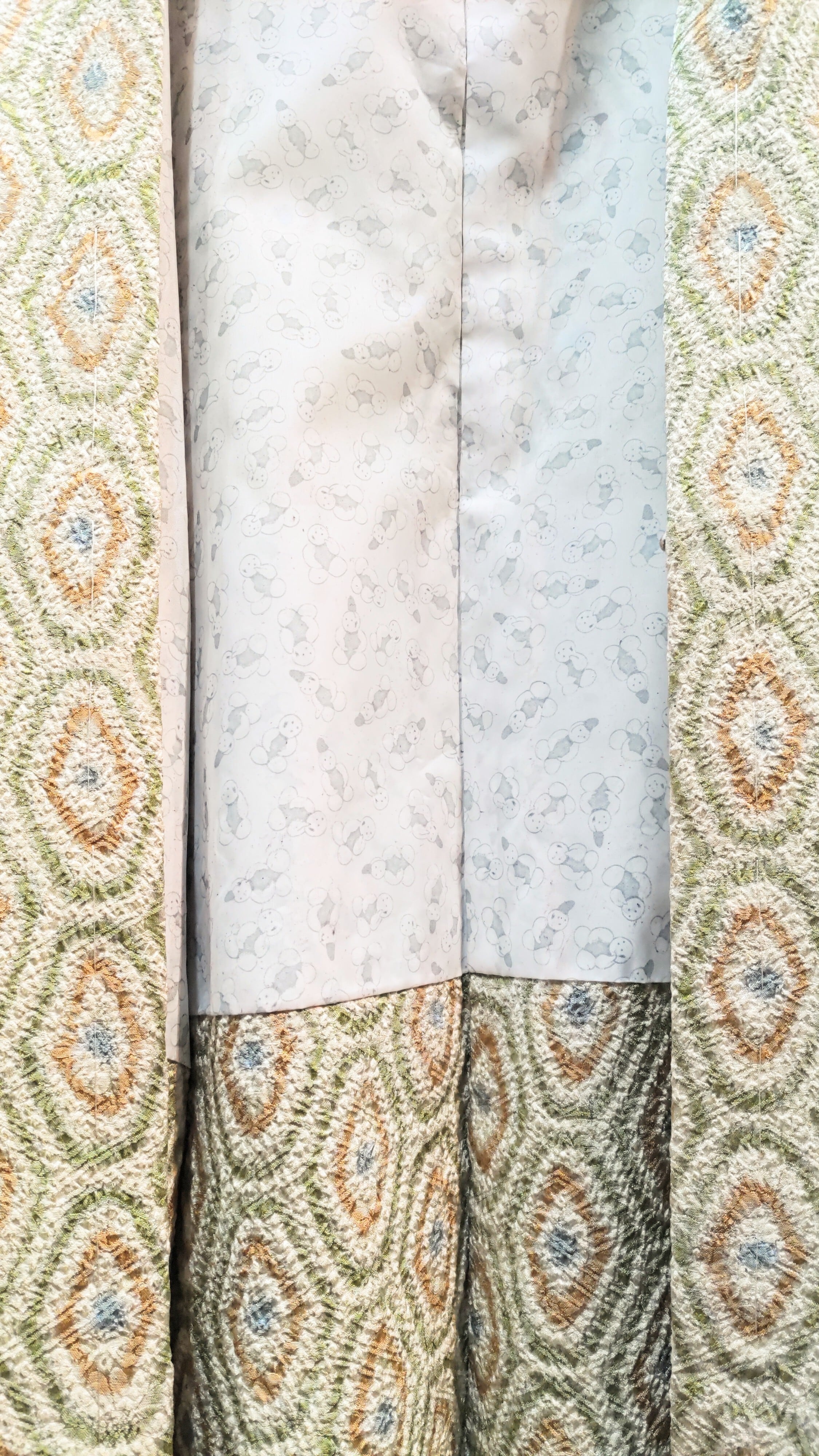 白地に明るく深みのある緑色(濃い抹茶ラテのような緑色)、少しグレー色よりのくすんだ薄い青色、薄茶色の組み合わで染められた亀甲柄。