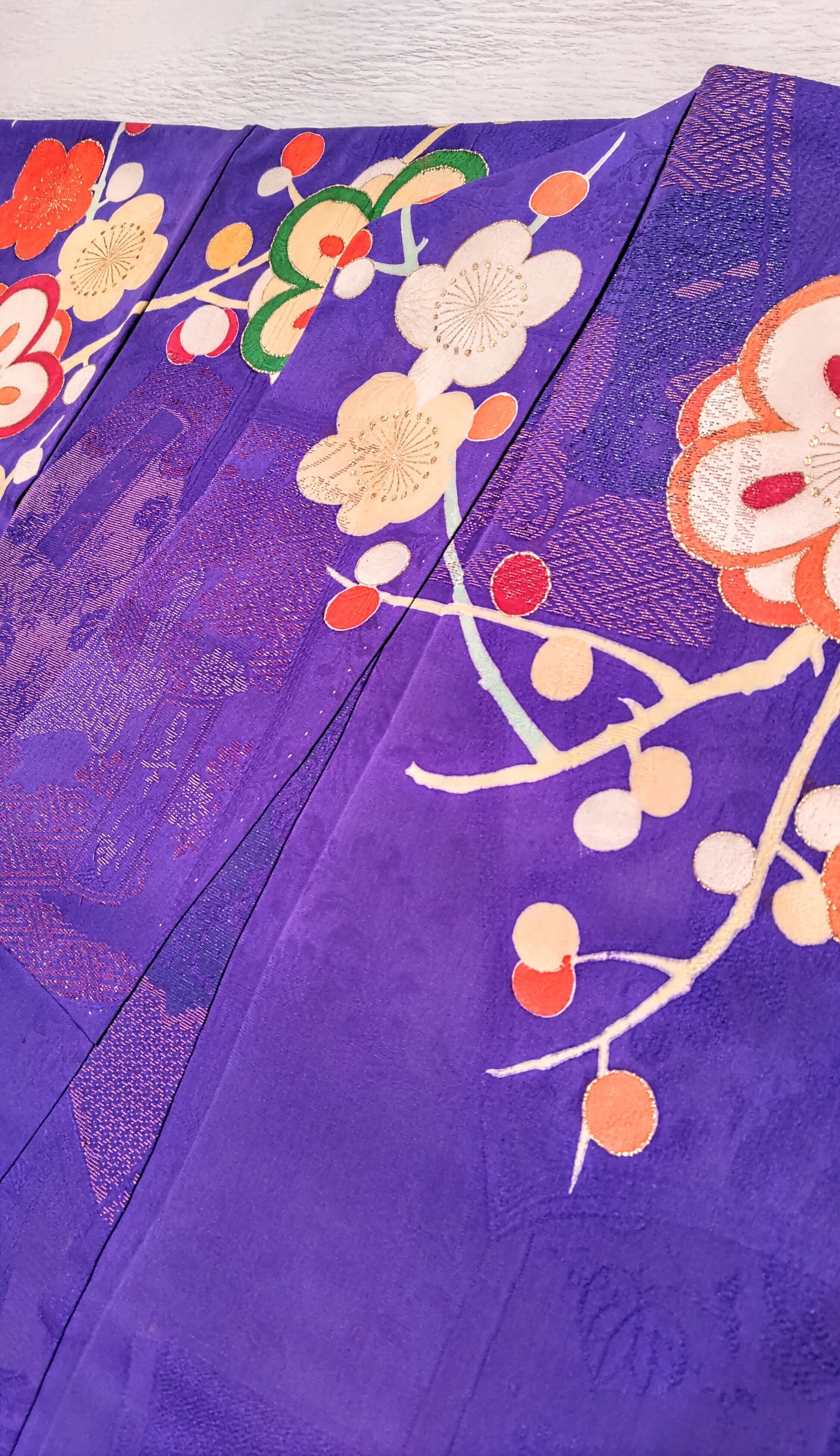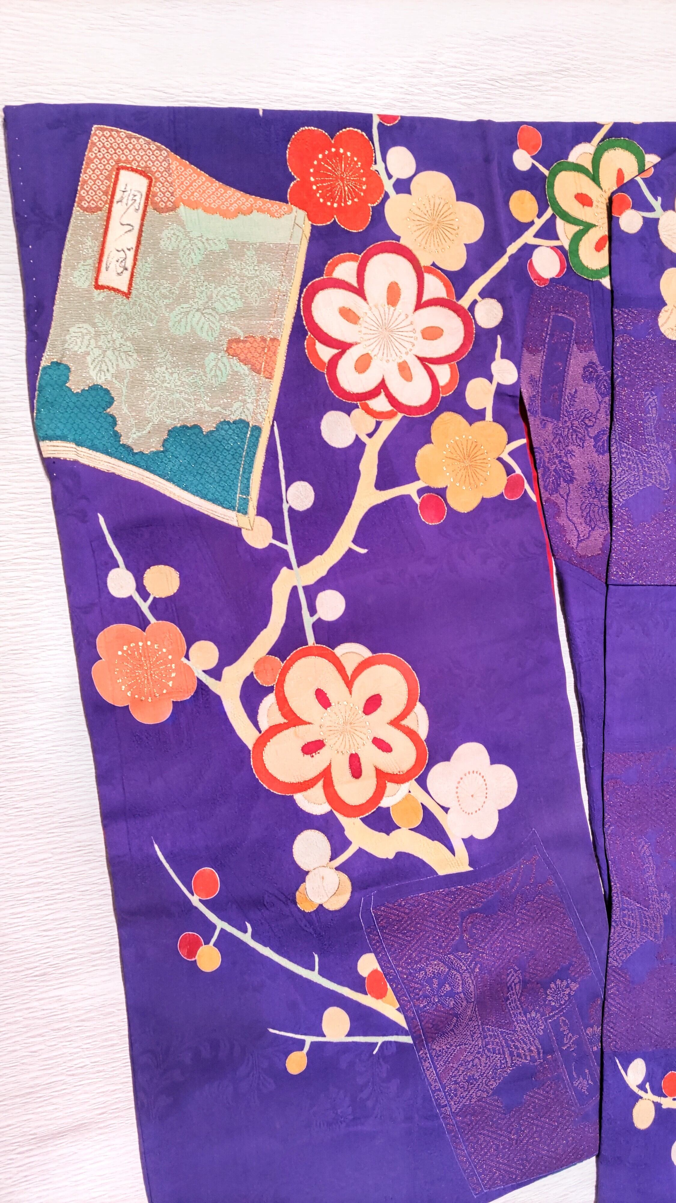 こちらは唐花と源氏物語の冊子柄の豪華な地紋を漆糸で刺繍のような縫い取りにより地紋おこし、その上に梅と冊子を染め、淡く優しいお色、はっきりとした差し色は当時の人気色。