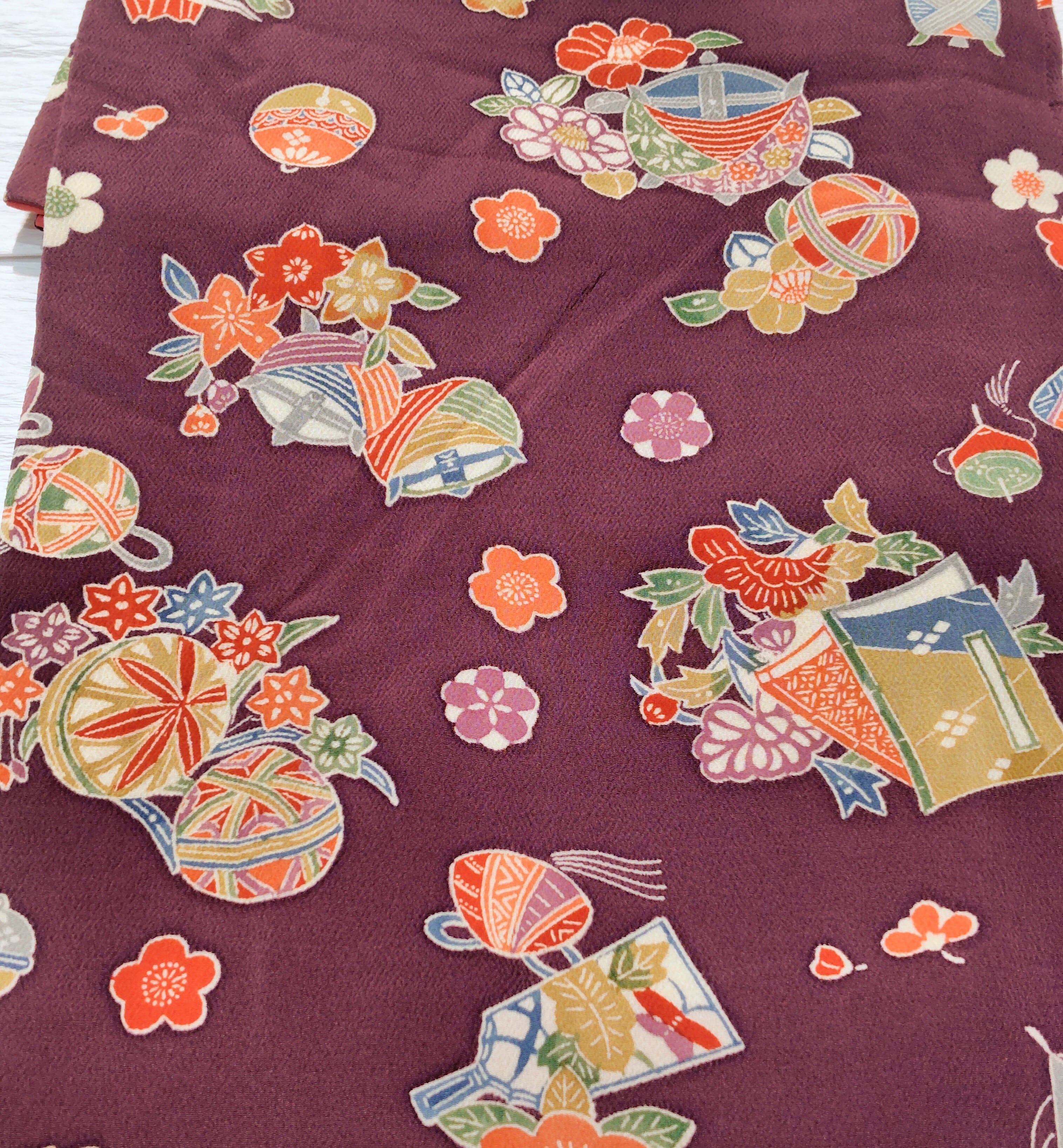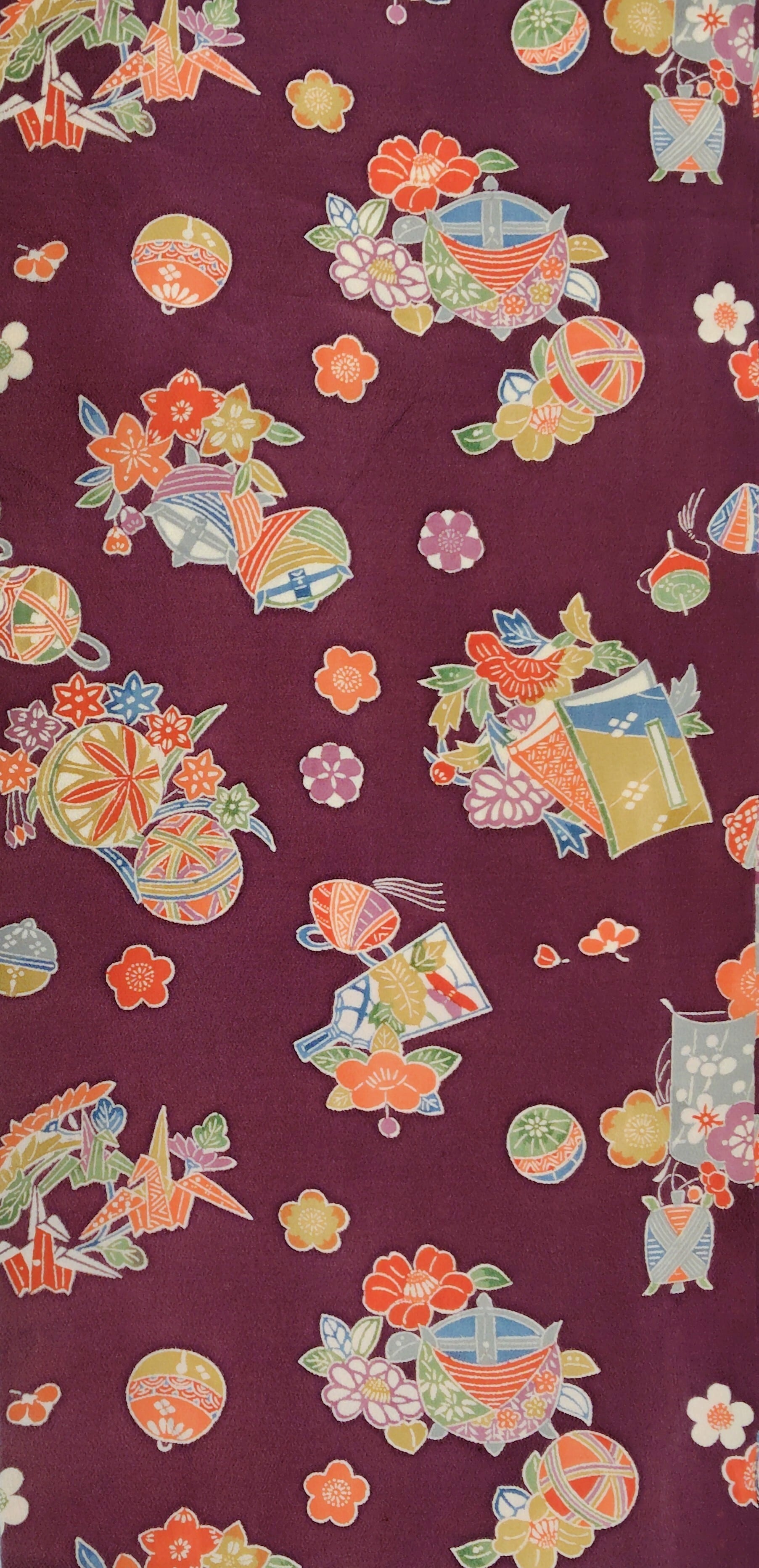 冊子(文庫)、糸巻き、手毬、羽子板、凧、独楽、折り鶴と古典的なお花尽くし。