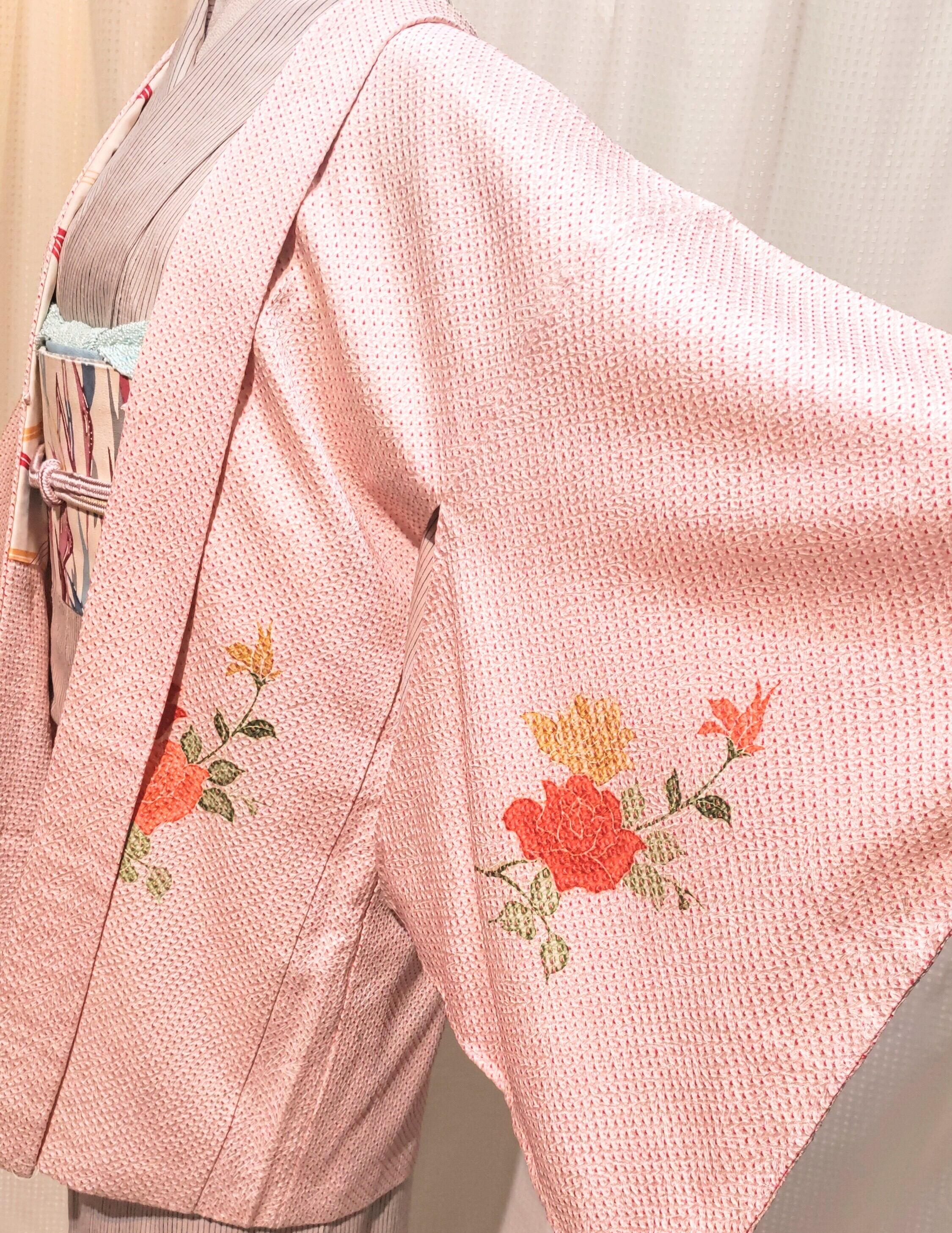 総絞りの羽織り いちごミルク色〜美しい薔薇柄〜