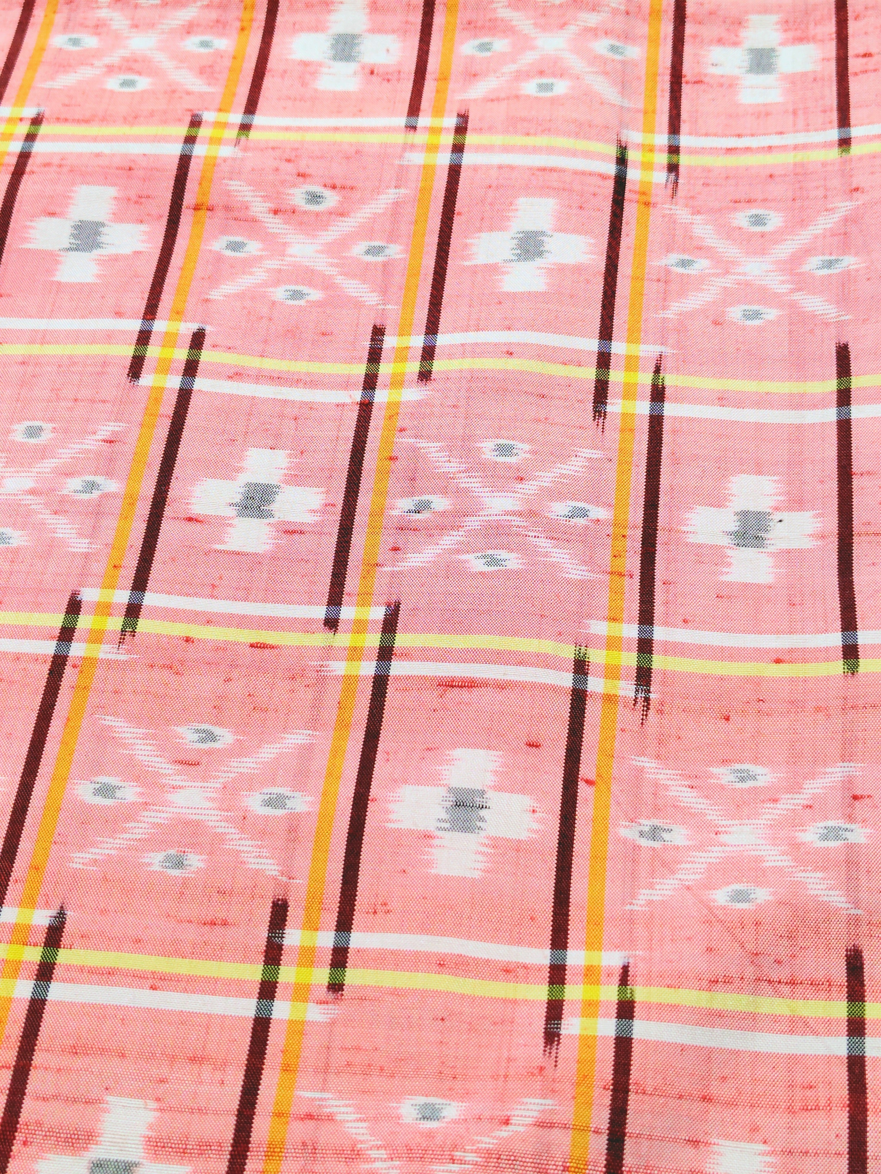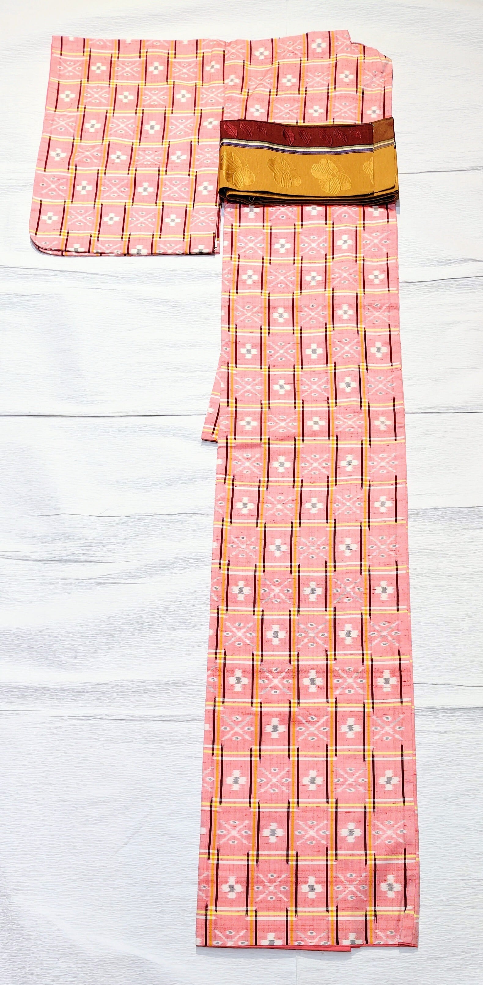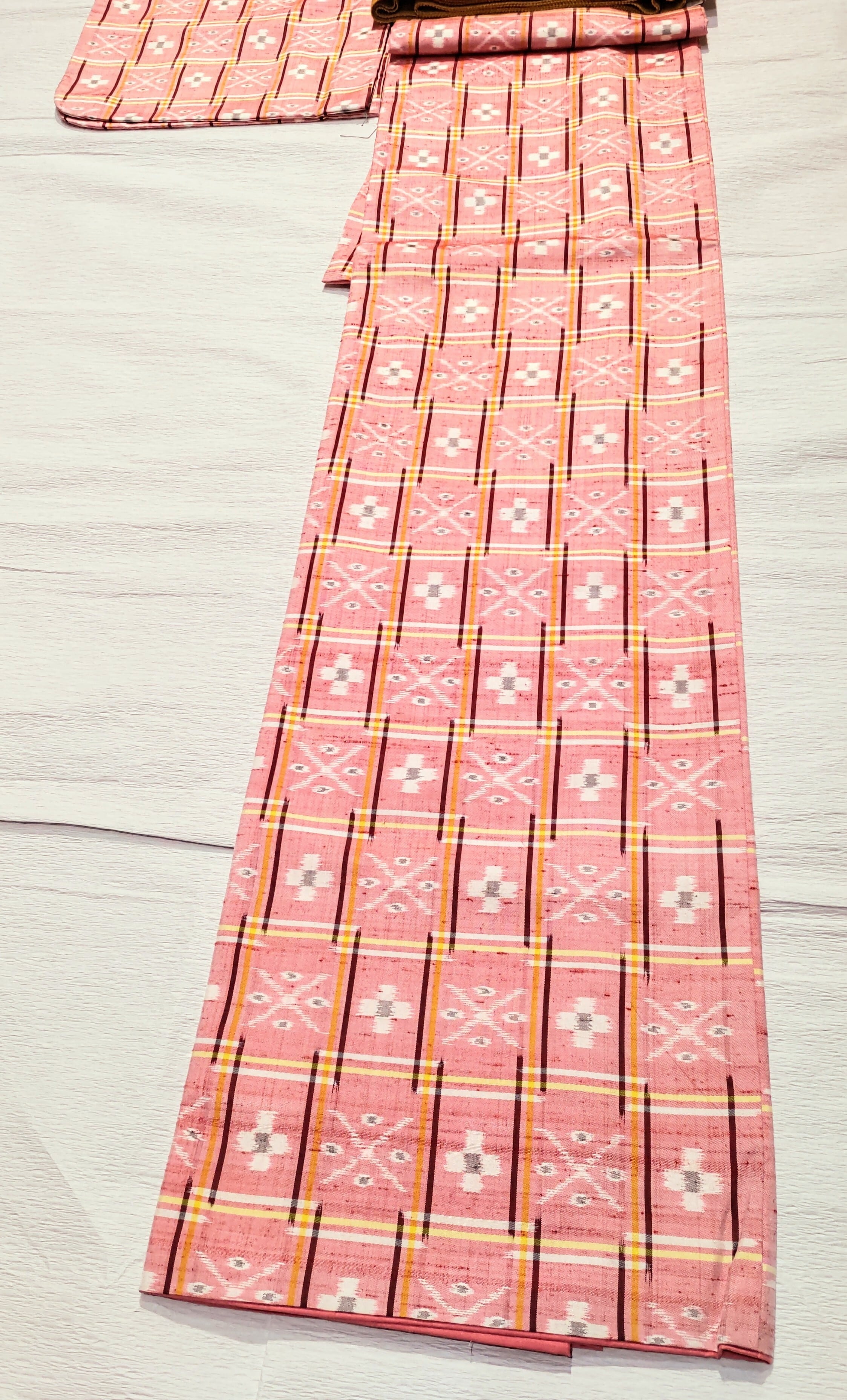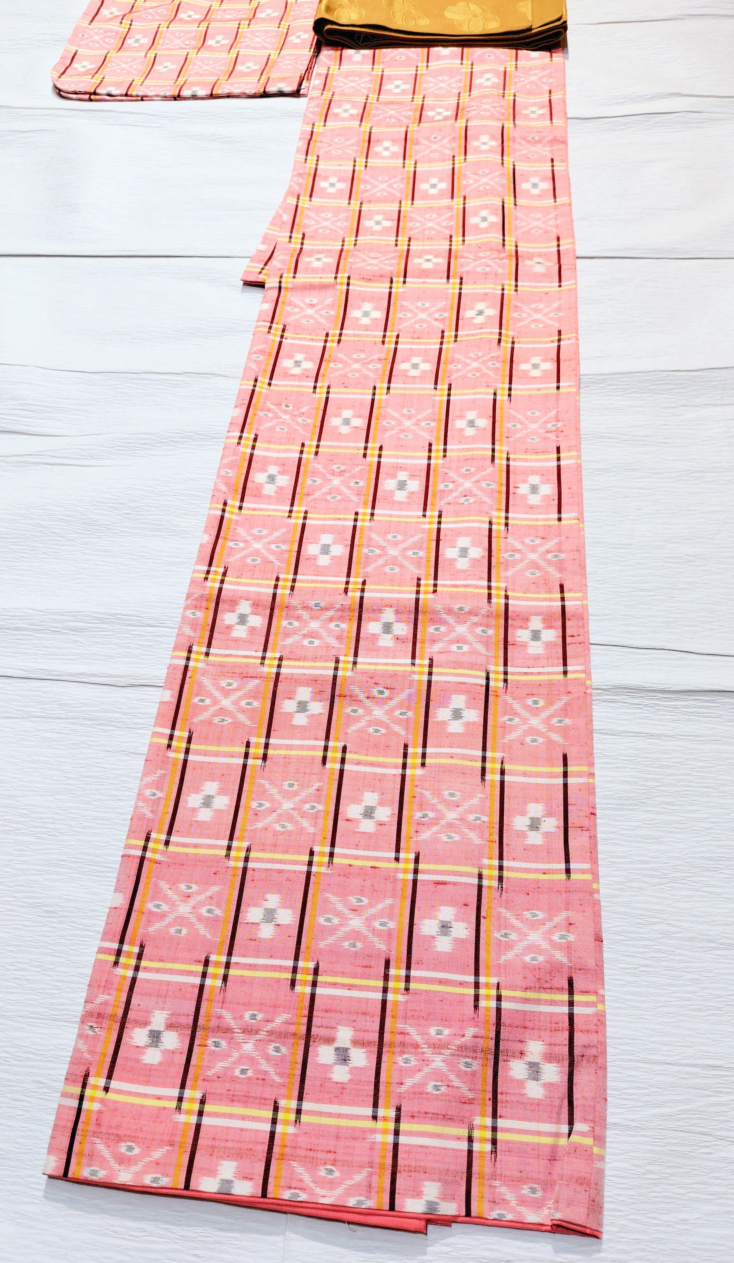琉球絣 淡い赤色、山吹色、臙脂色です。