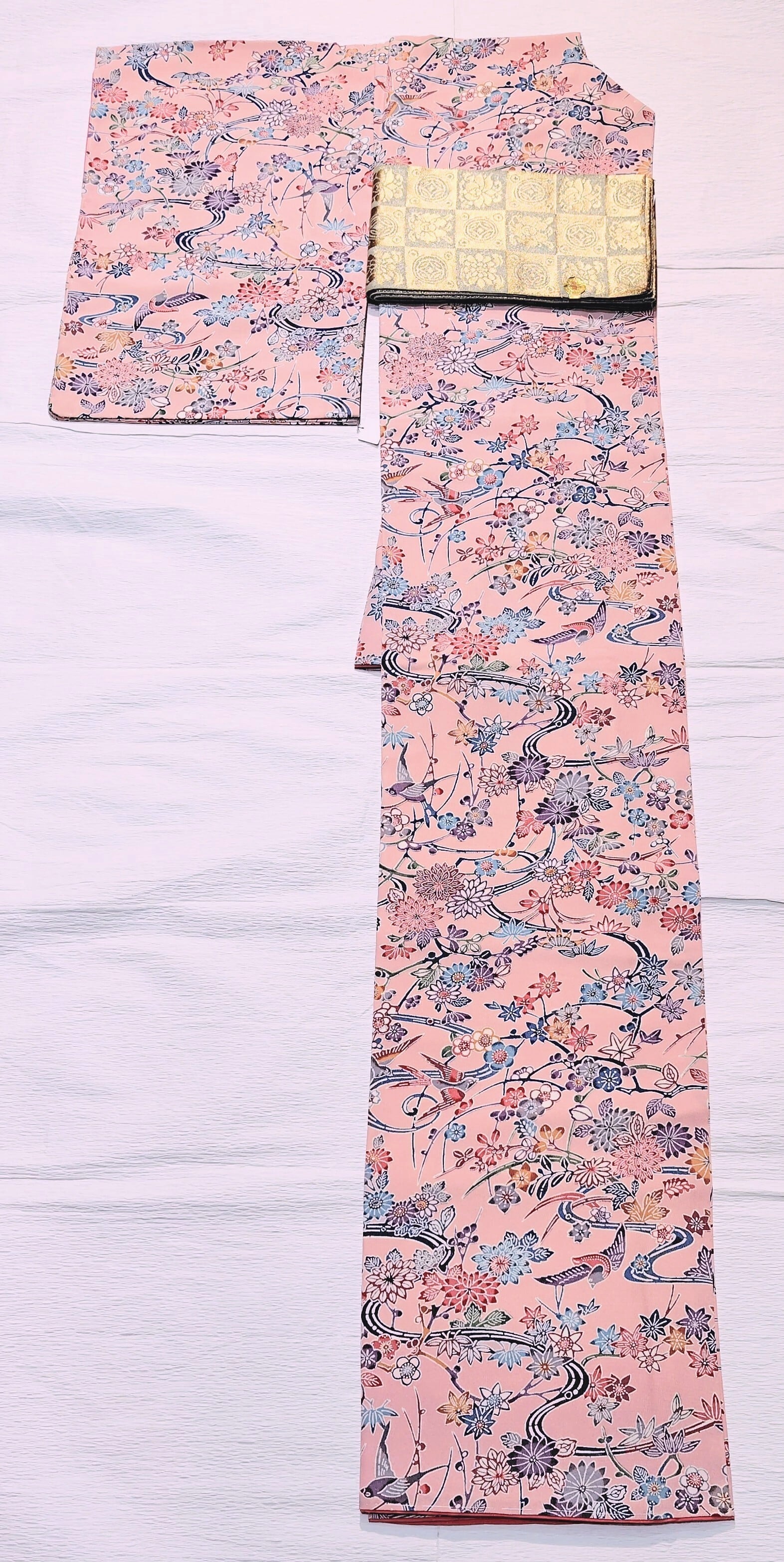 苺ミルクのような淡くミルキーなピンク色に淡い色とりどりのお花や鳥さんが華やかで可愛い印象の小紋です。