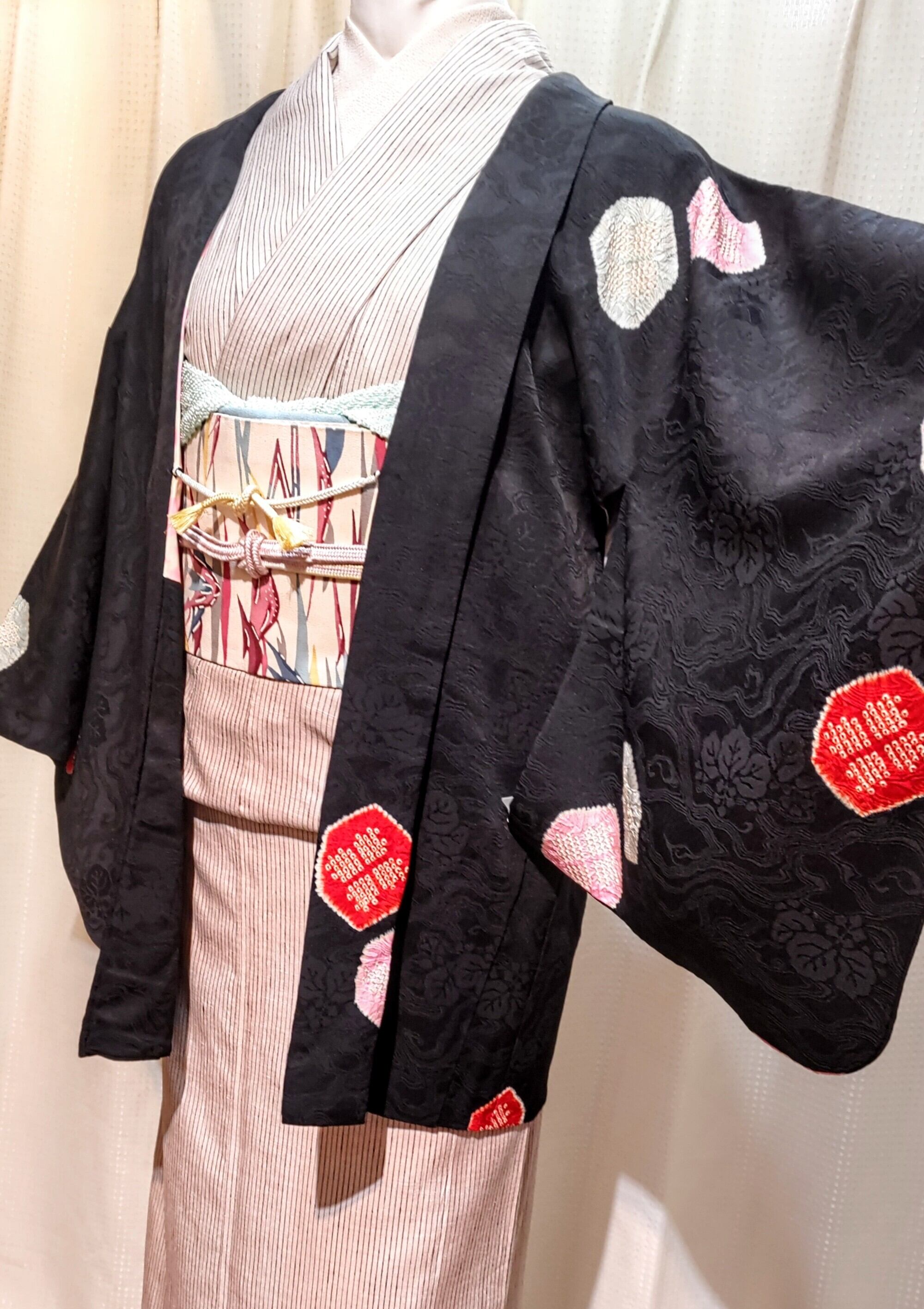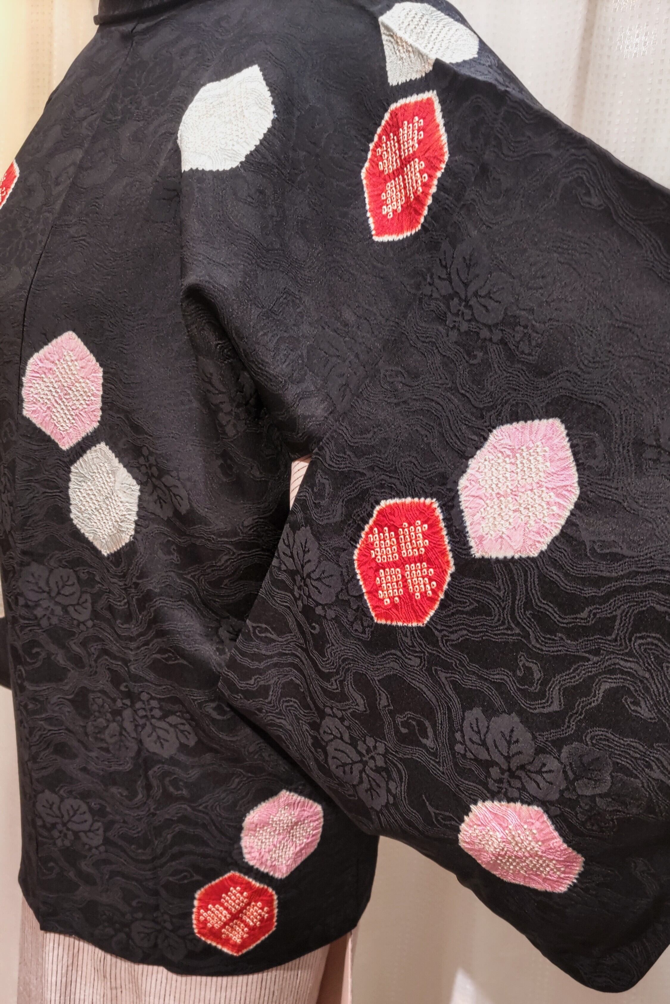 黒地に絞りの羽織り〜赤色、ピンク色、水色の亀甲柄〜