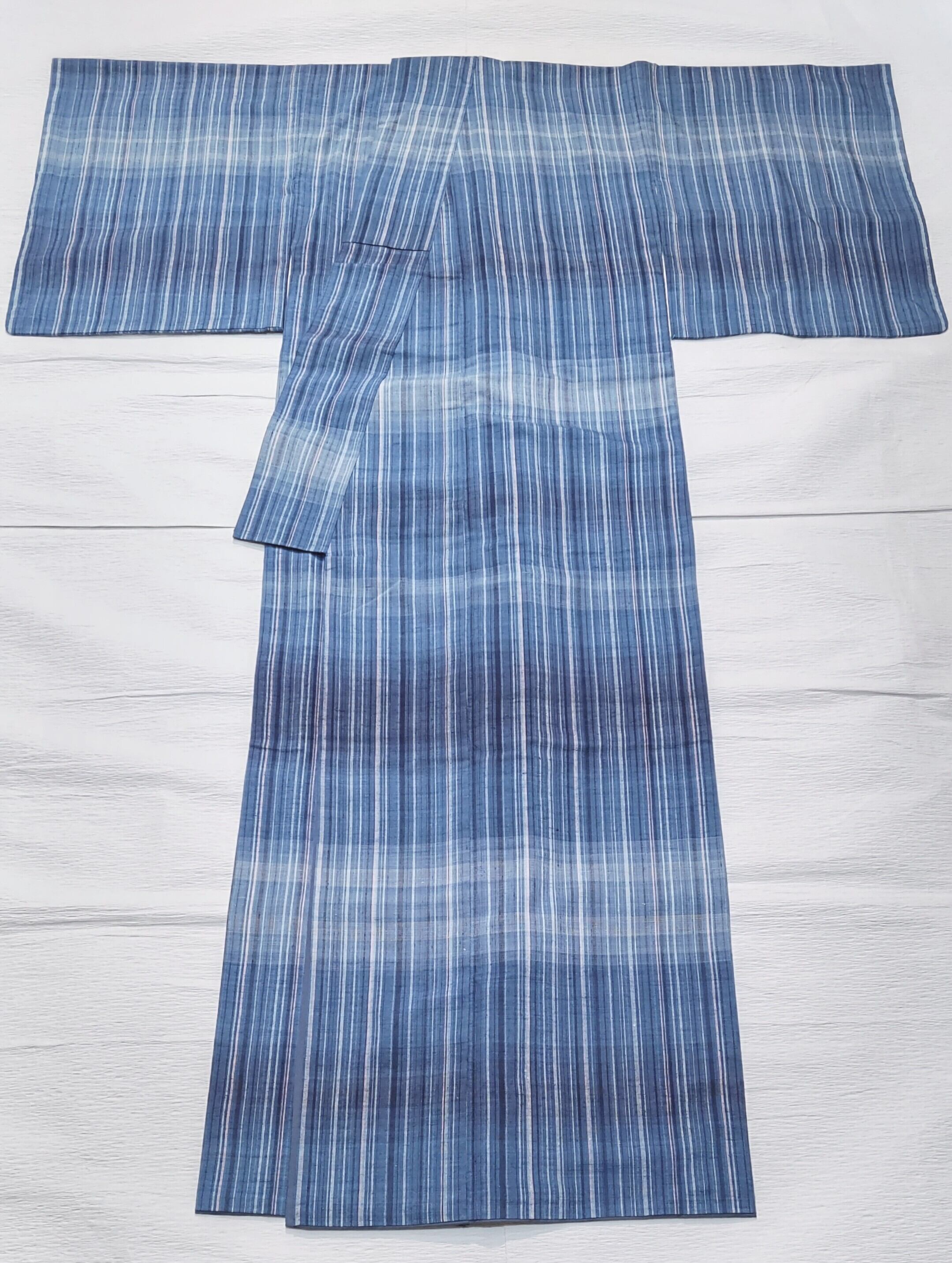 紺色と青色は藍染め、白色と桜のような淡いピンク色が差し色になっている縞柄(ストライプ柄)は、すっきりとした爽やかな印象。